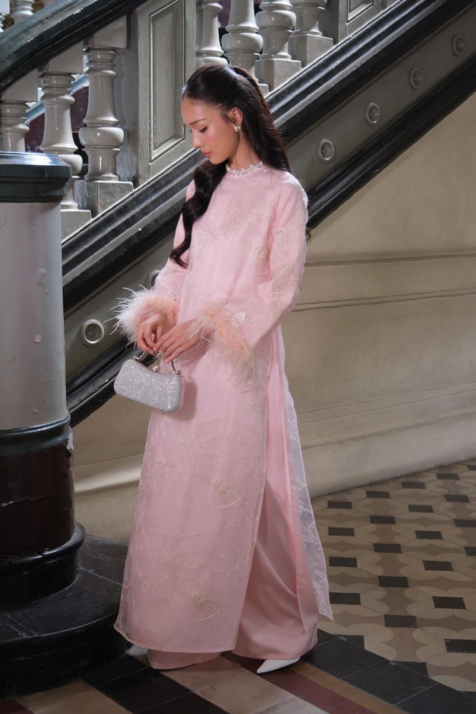 Áo dài hồng tay lông MAISON HAVU