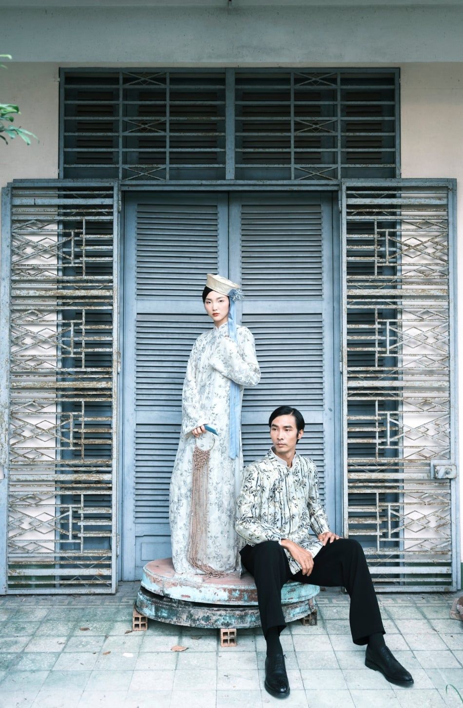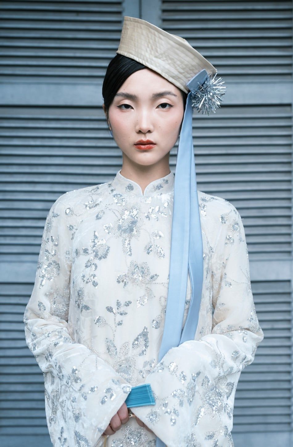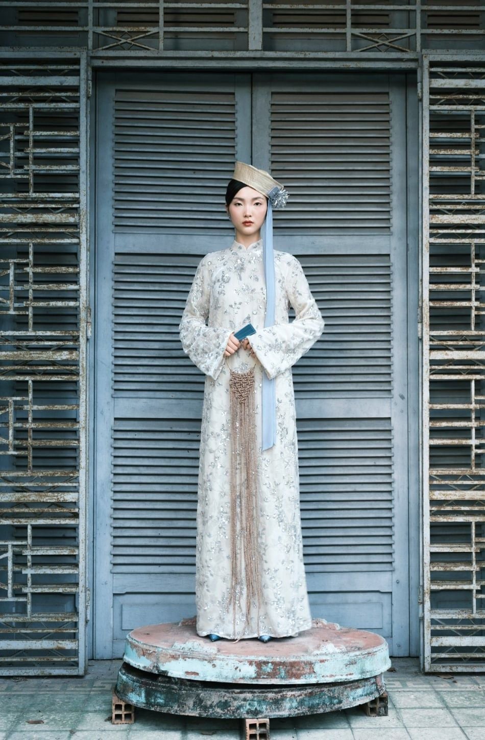 W - Áo dài BẠCH PHI quần metalic xanh biển nhạt XÉO XỌ