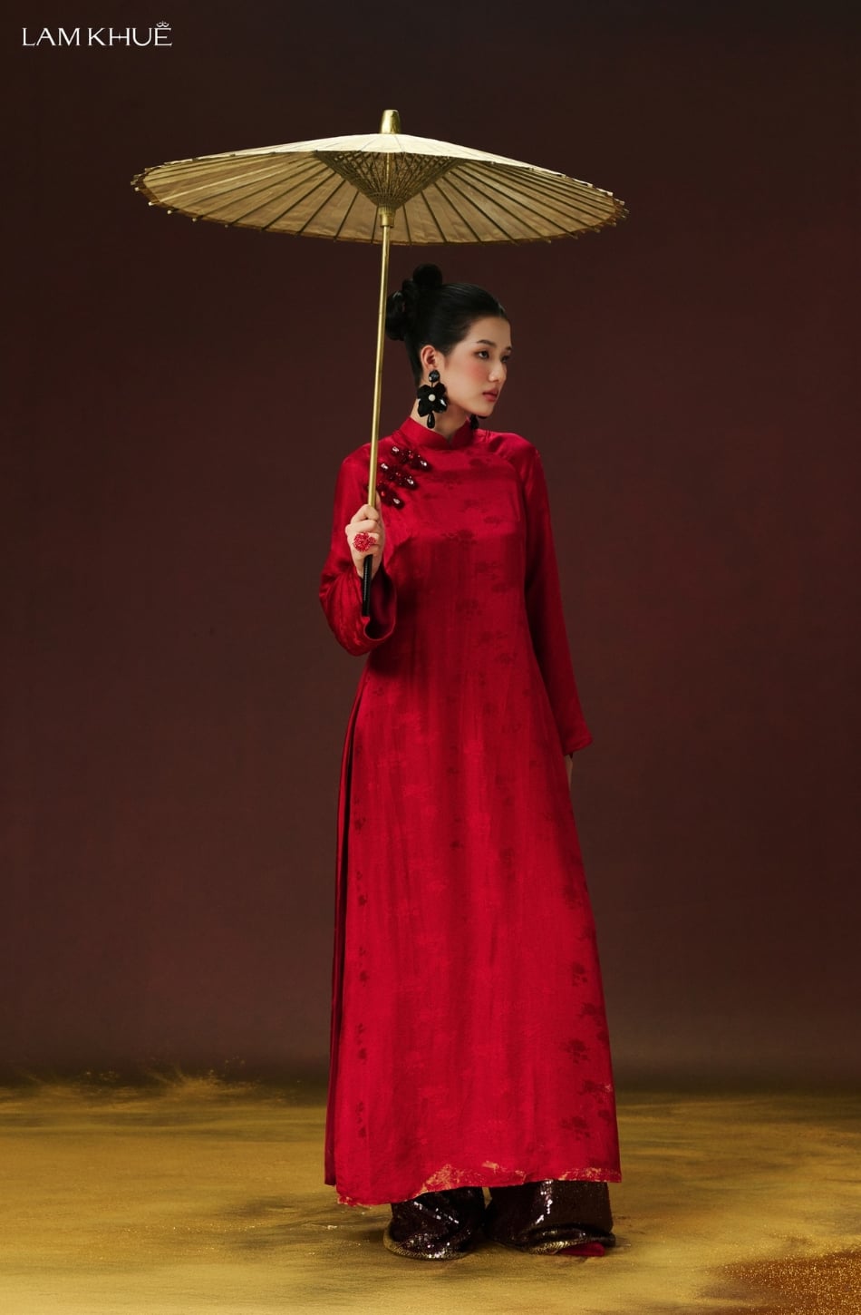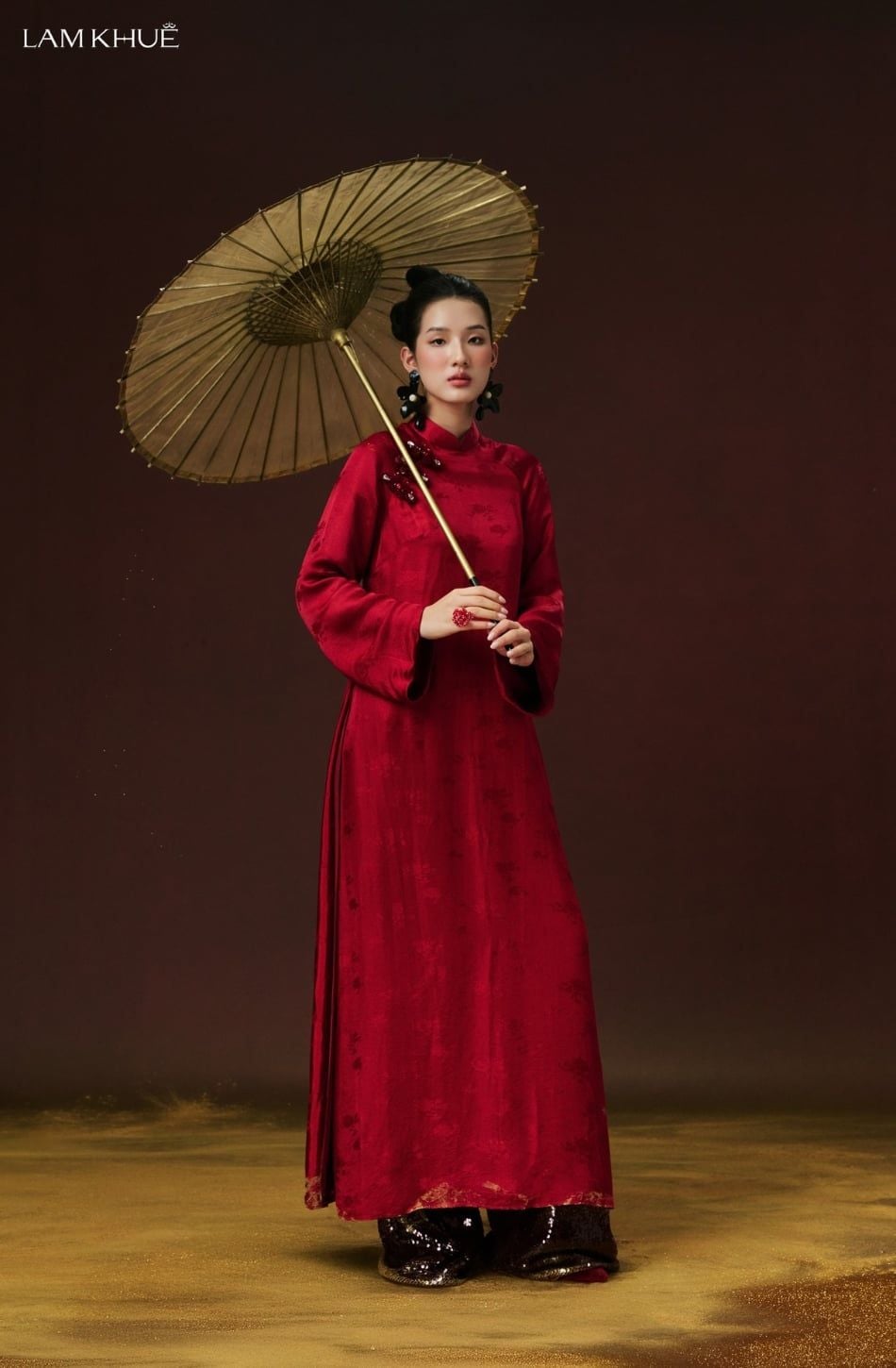 W - Áo dài đỏ SON DIỄM quần sequin LAM KHUE