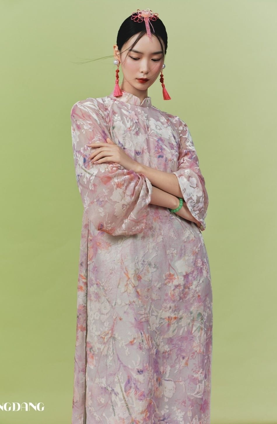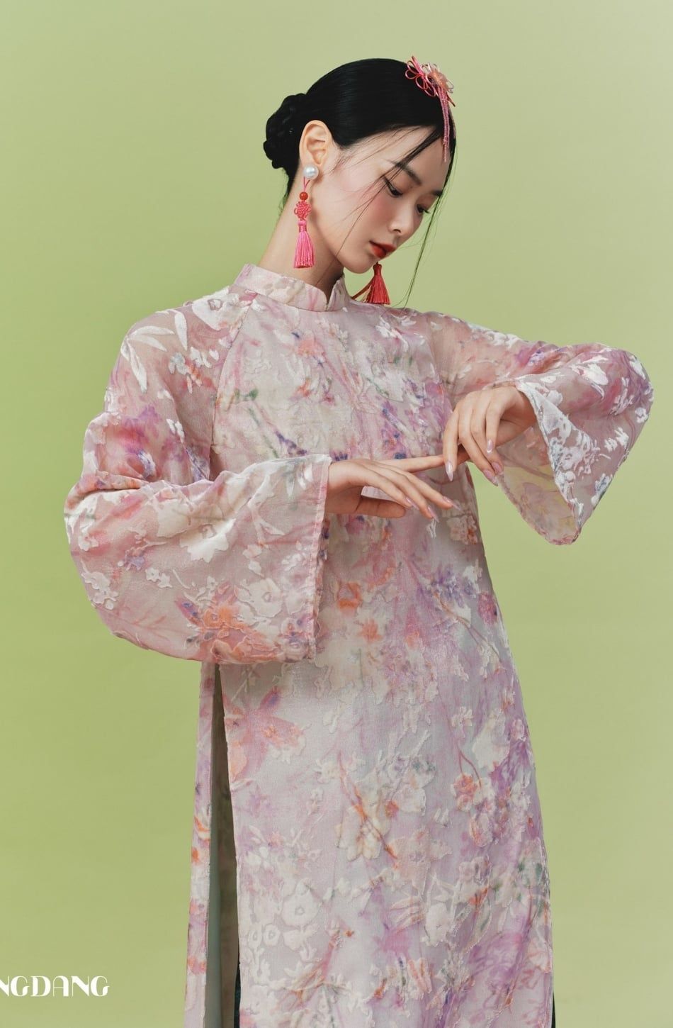 W - Áo dài hồng nhạt quần xanh rêu DINGDANG