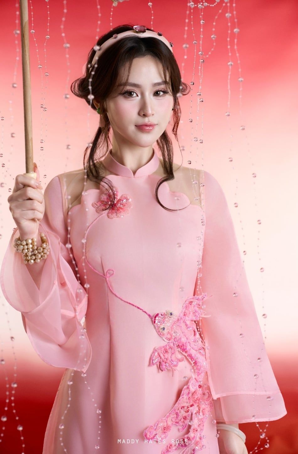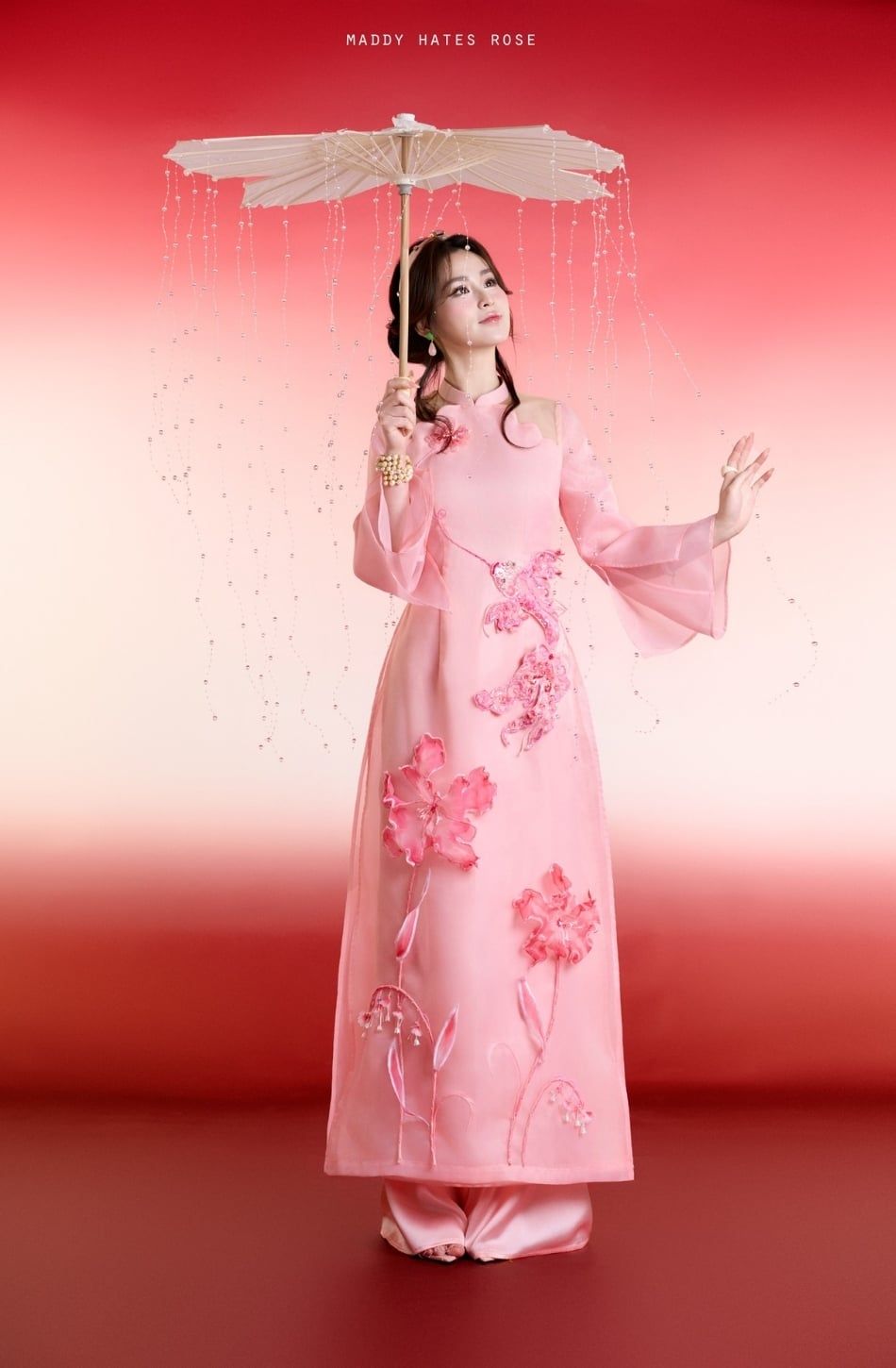 W - Áo dài hồng thêu hoa quần hồng MADDY HATE ROSE