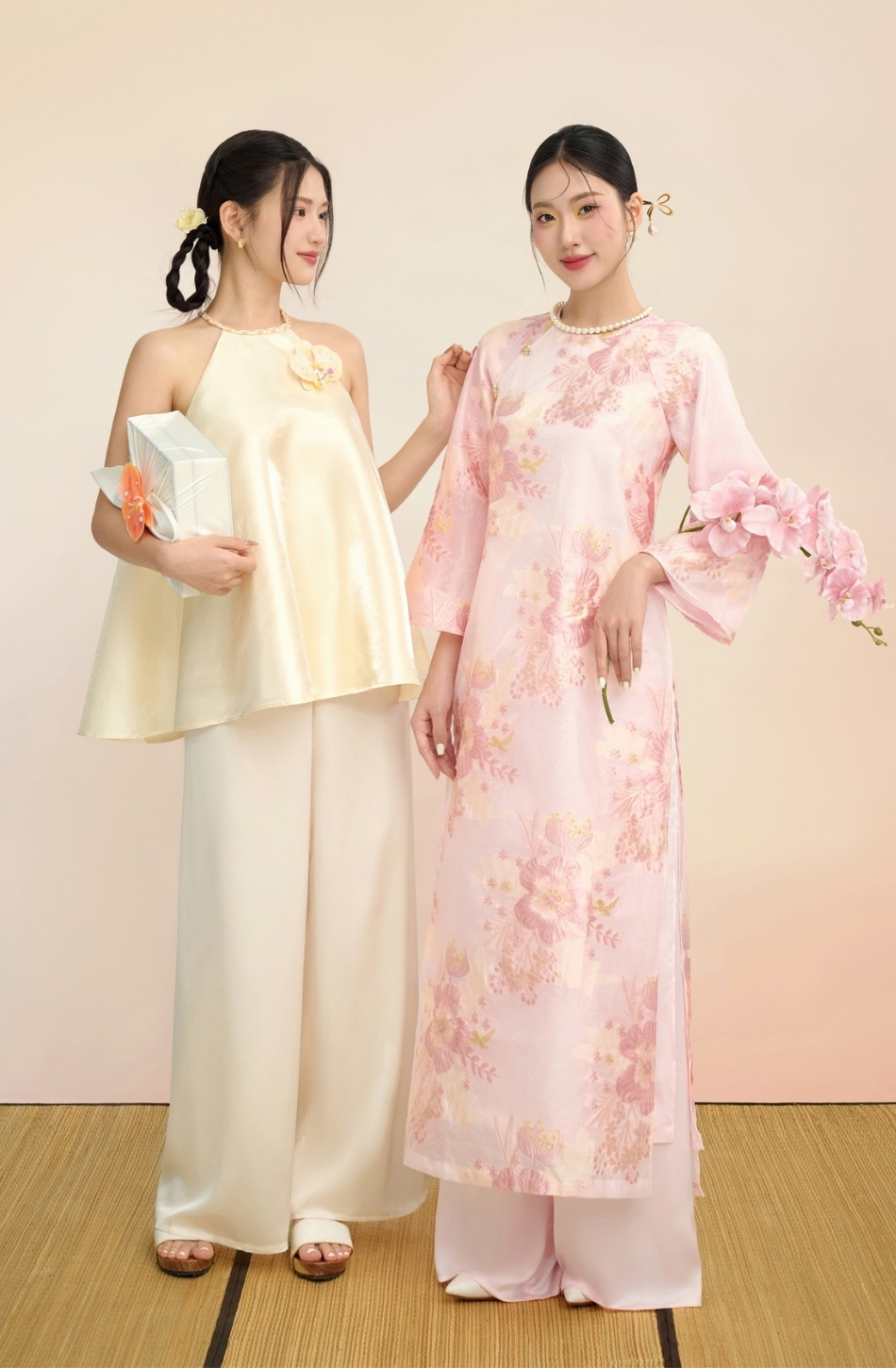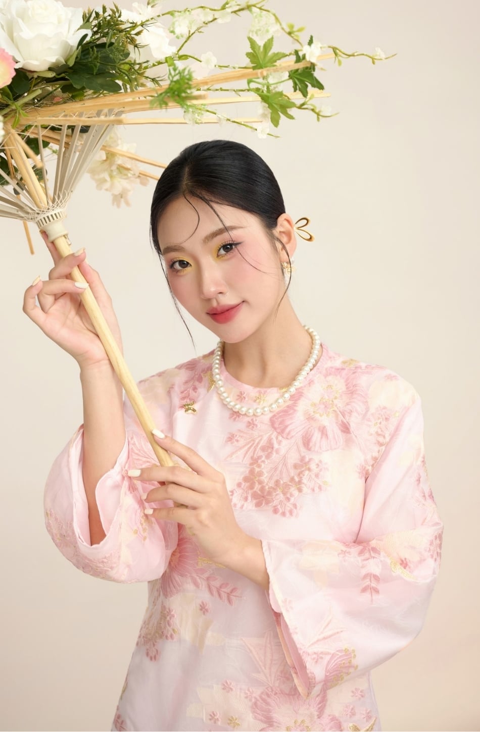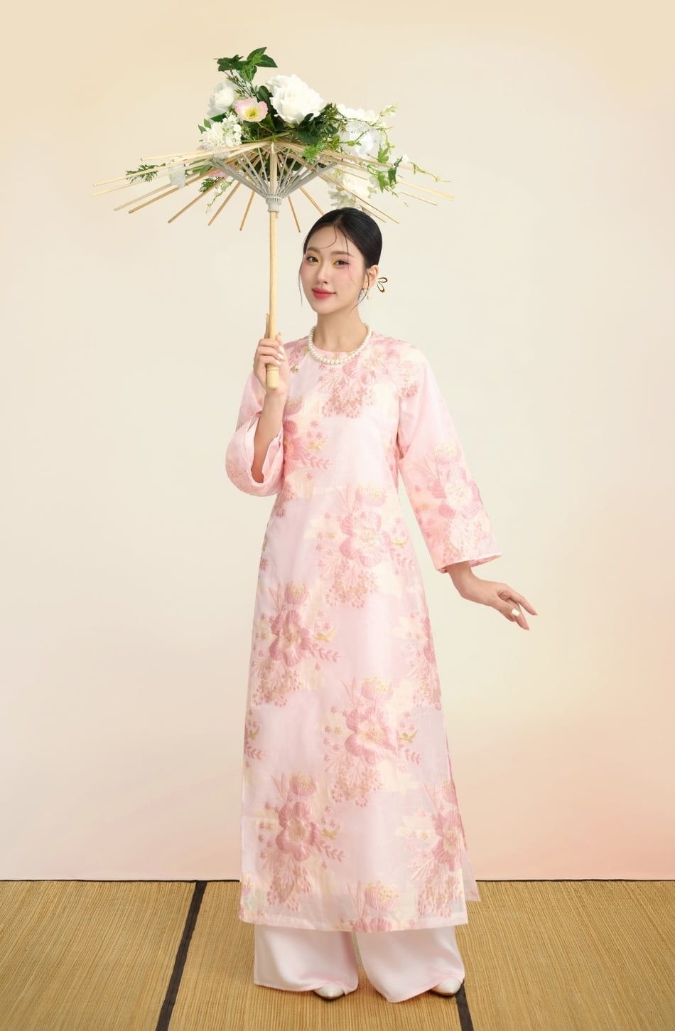 W - Áo dài hồng thêu hoa quần hồng nhạt EDINI