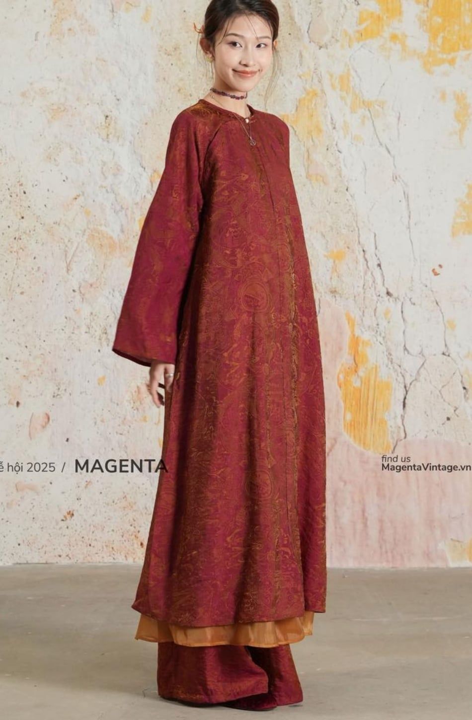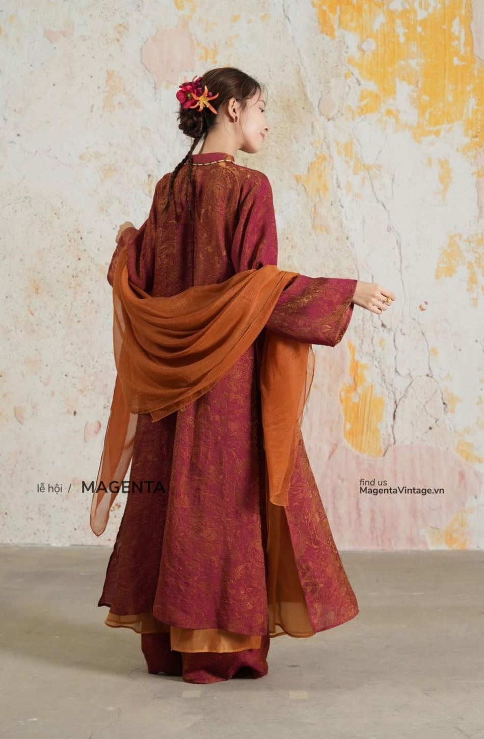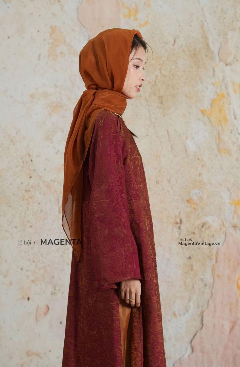W - Áo dài KIM CHÂU kèm khăn bông bay cam MAGENTA VINTAGE