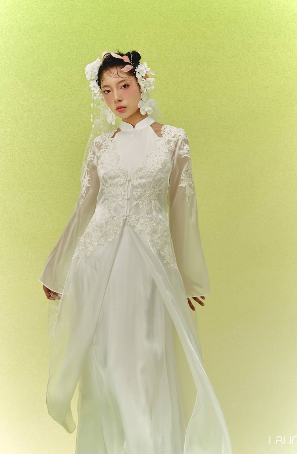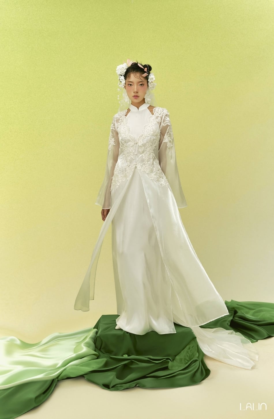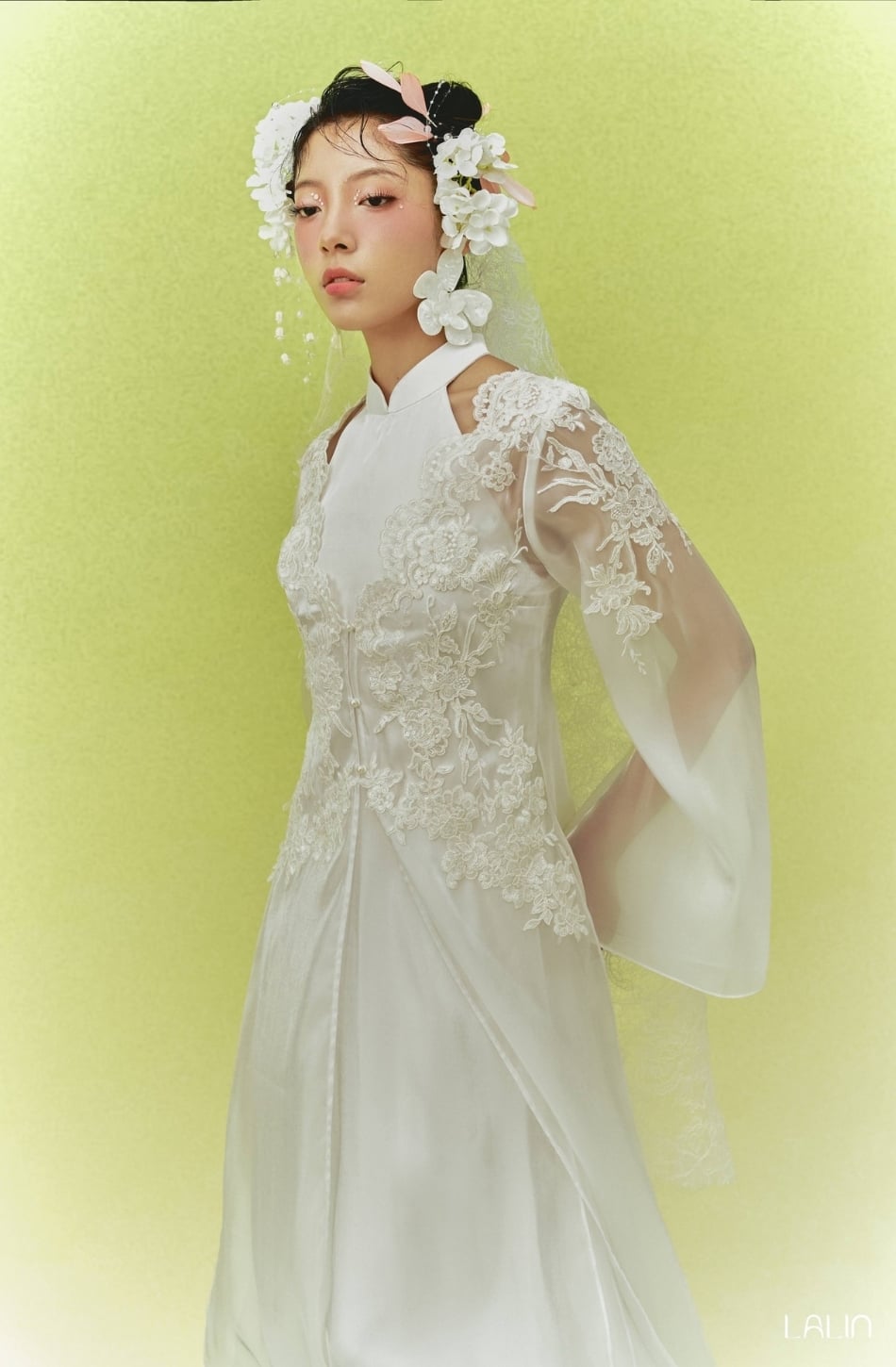 W - Áo dài trắng Yên Chi đính kết hoa 3d LALIN