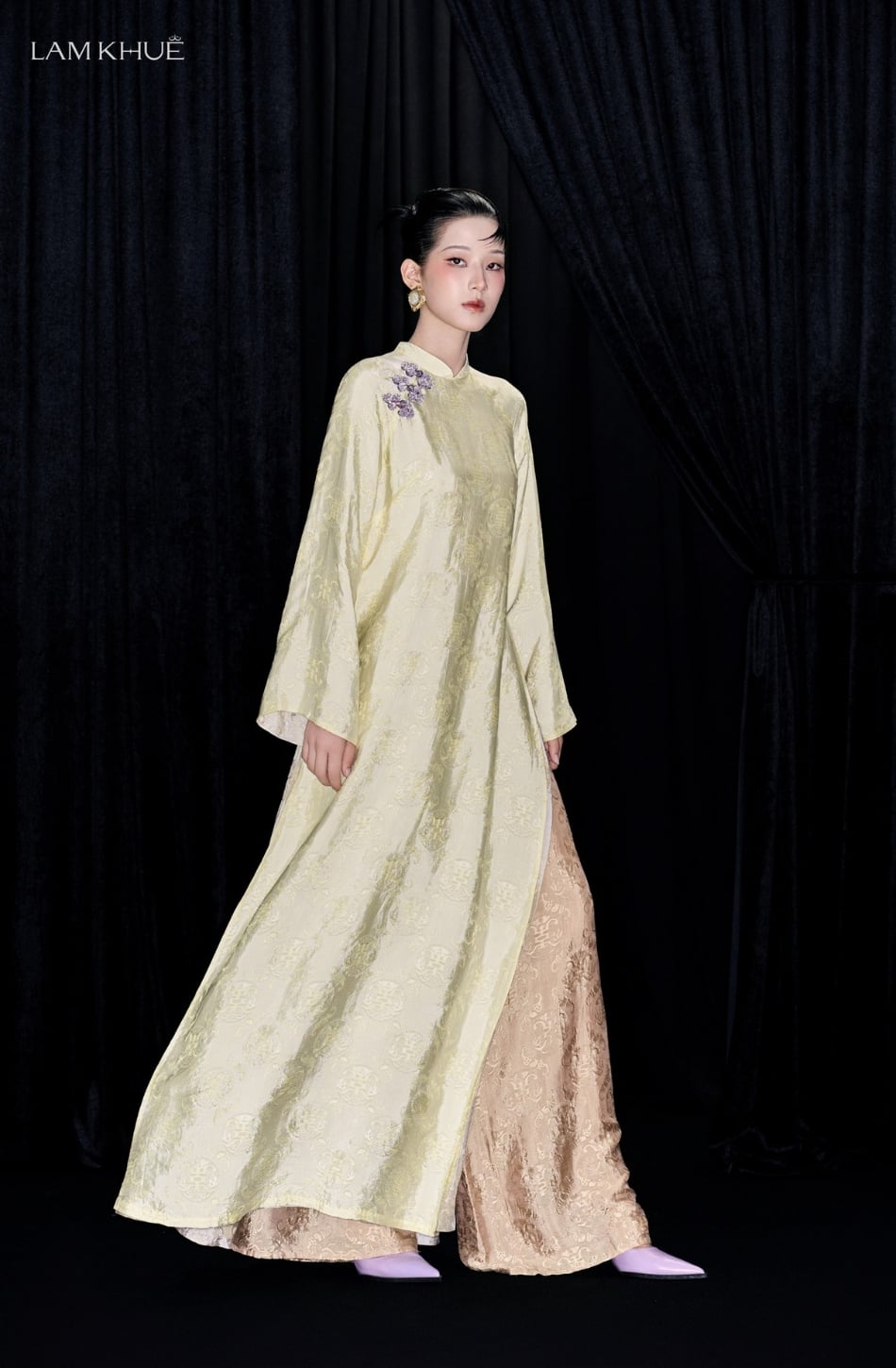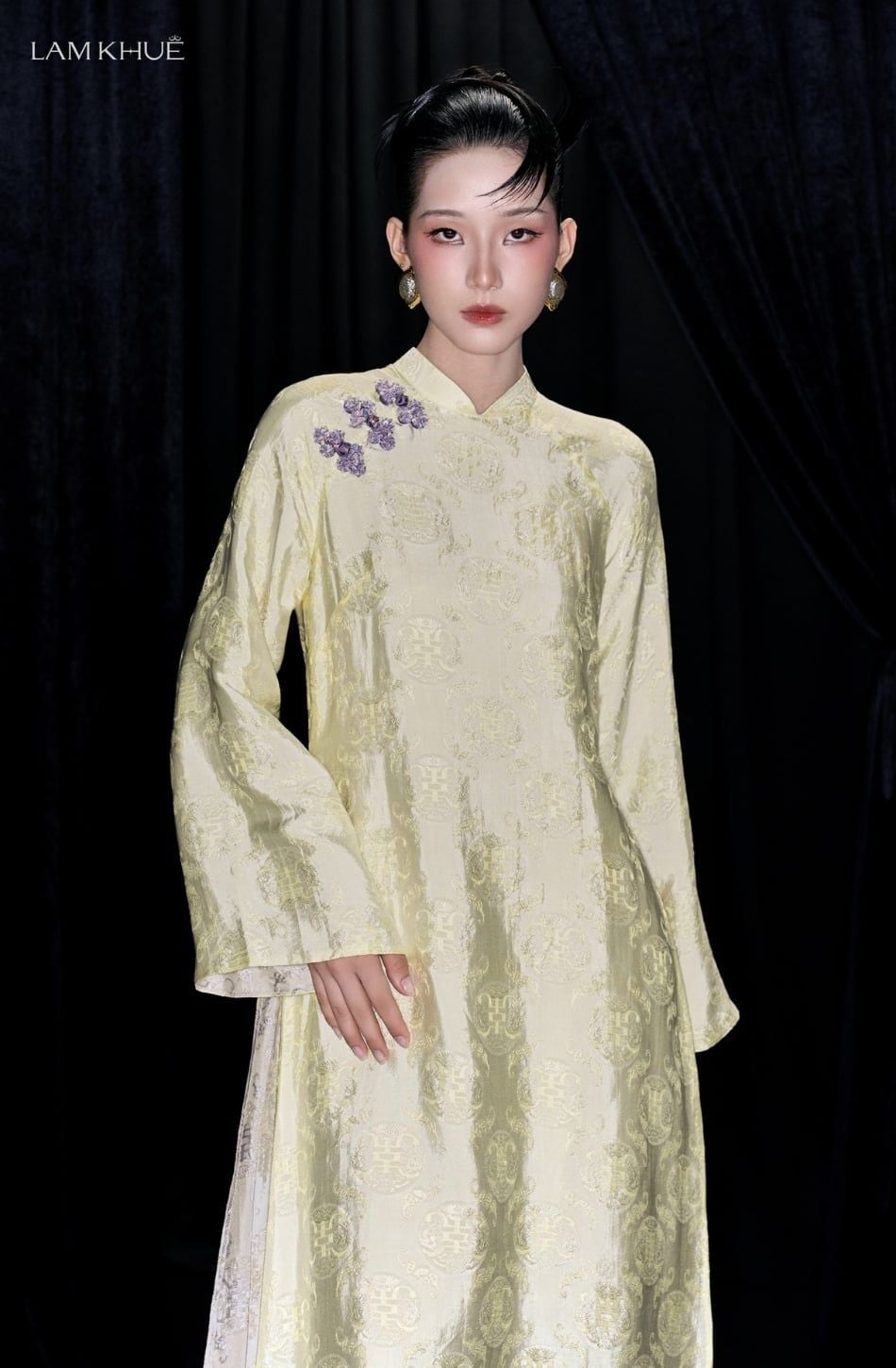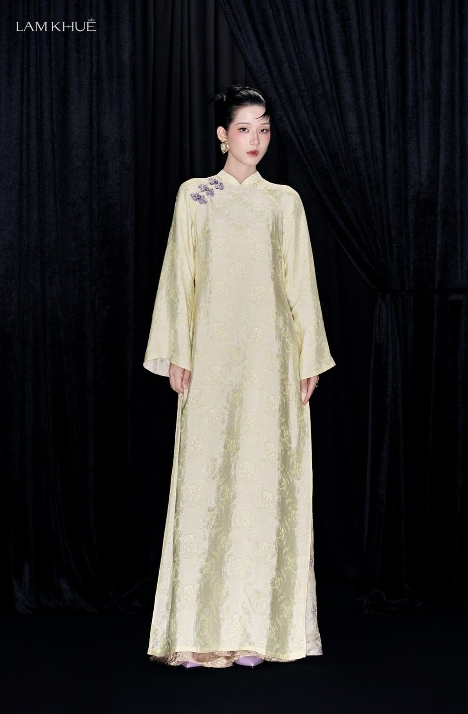 W - Áo dài vàng ánh bơ VI NHÃ hoạ tiết đính cườm tím trên vai LAM KHUE