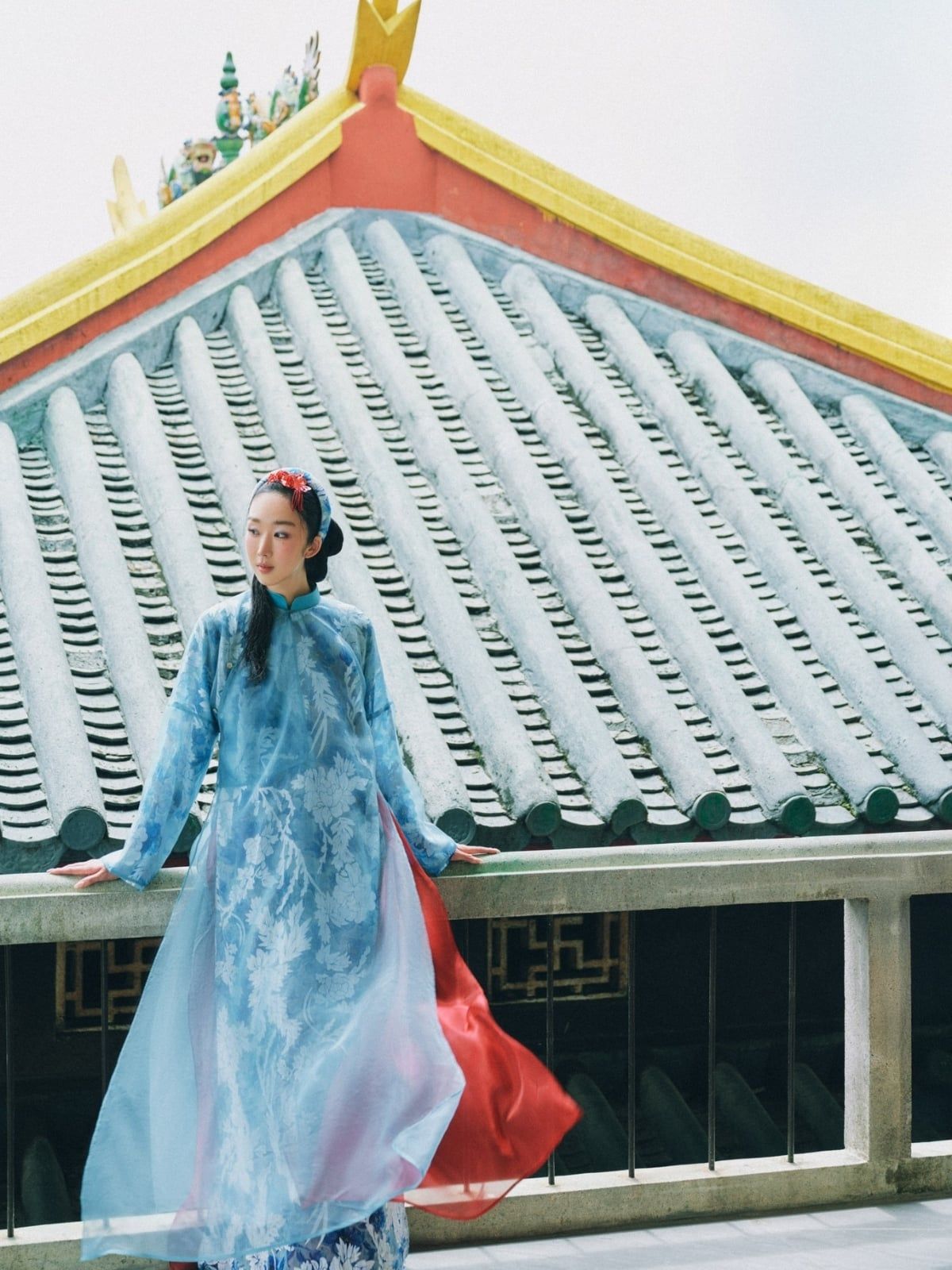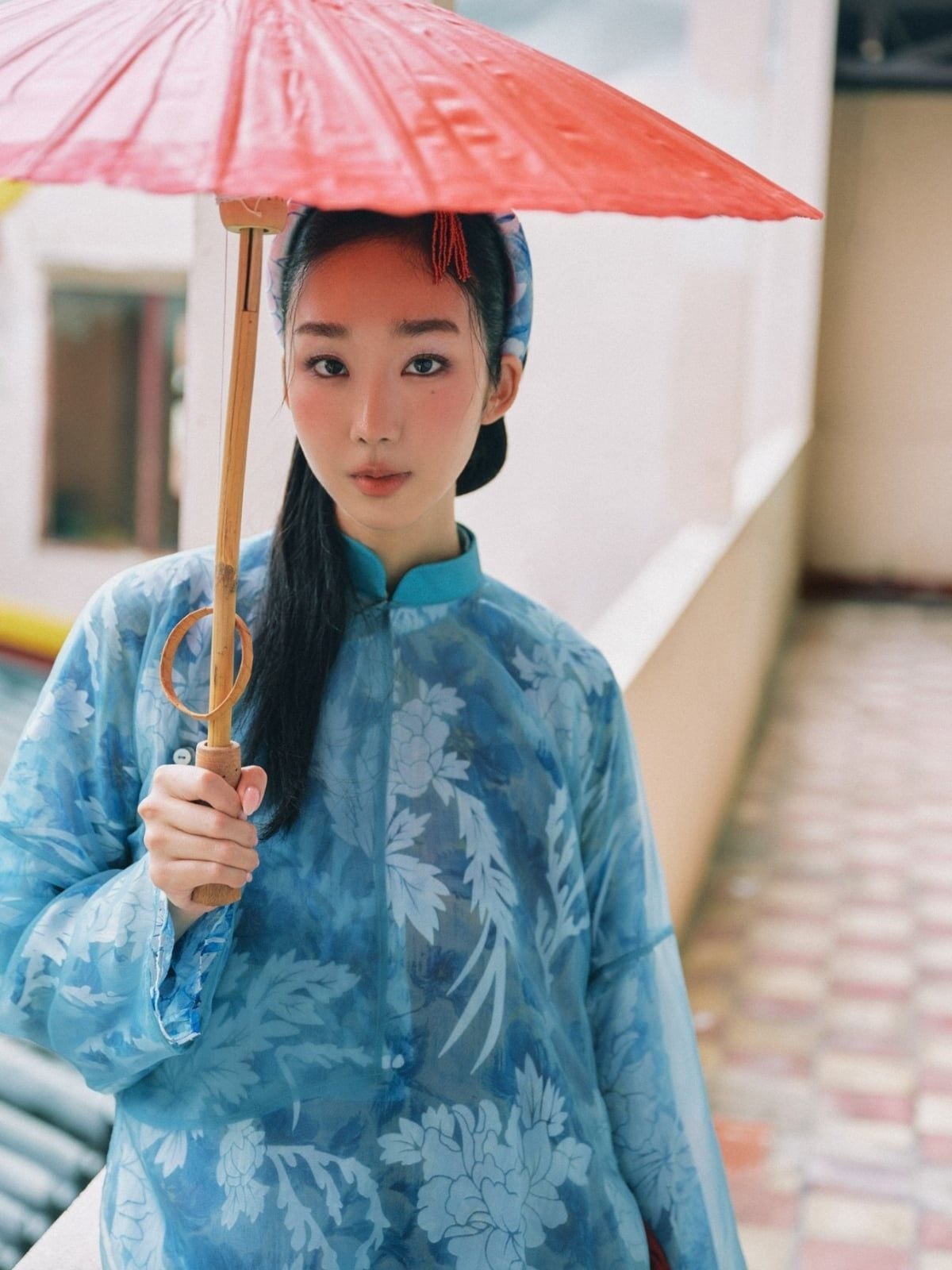 W - Áo dài xanh dương quần đỏ DINGDANG - CÓ 2 BỘ