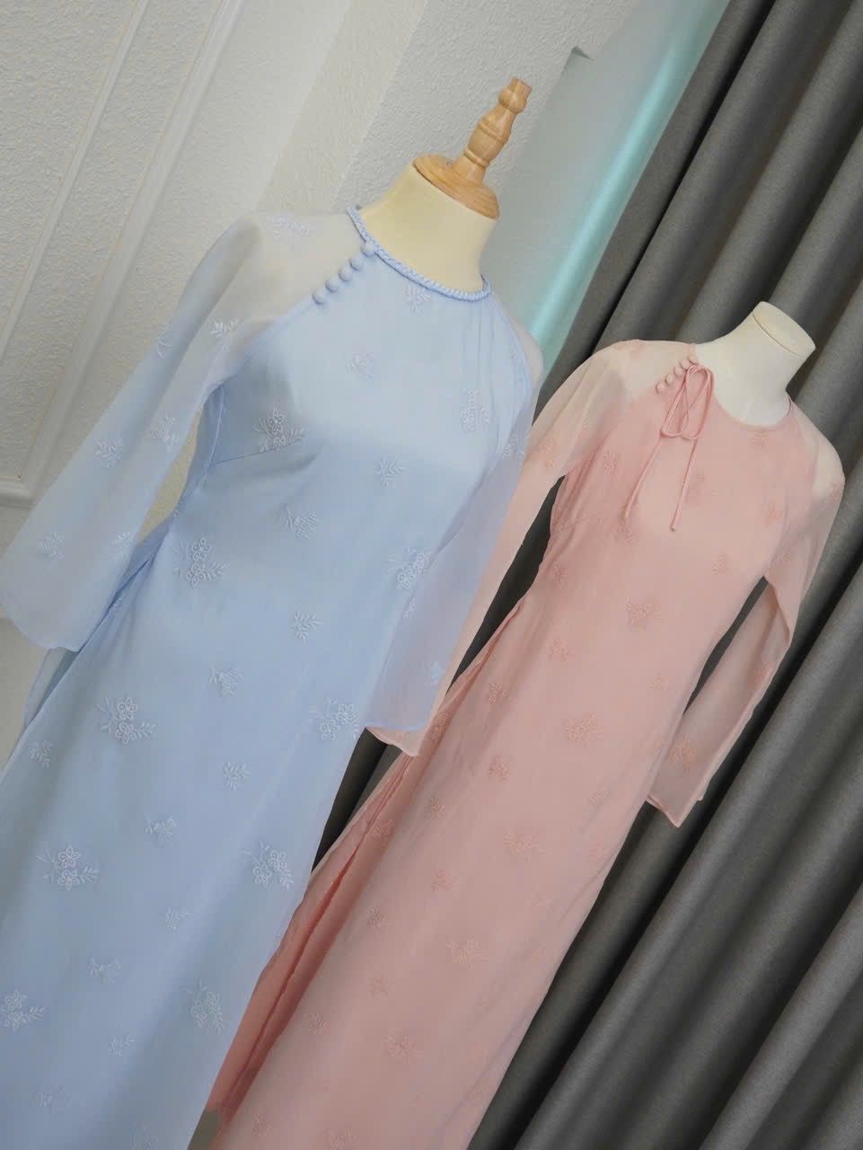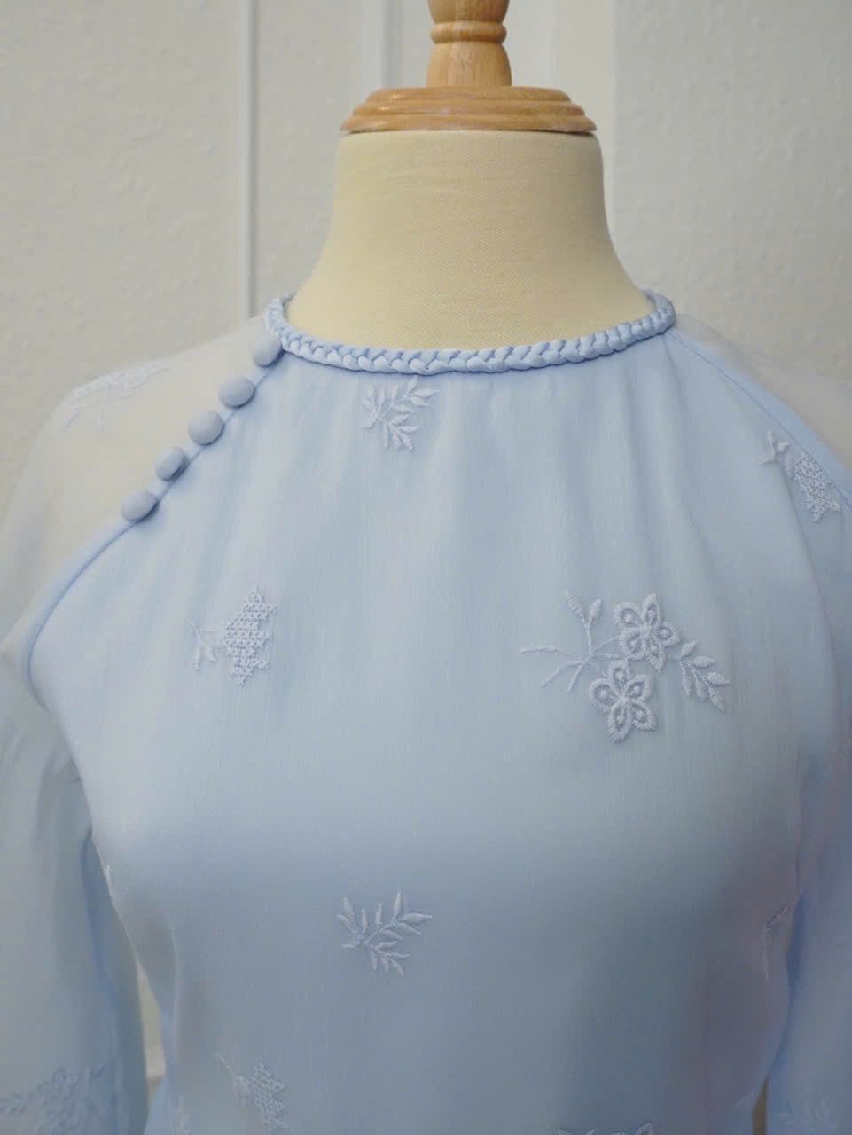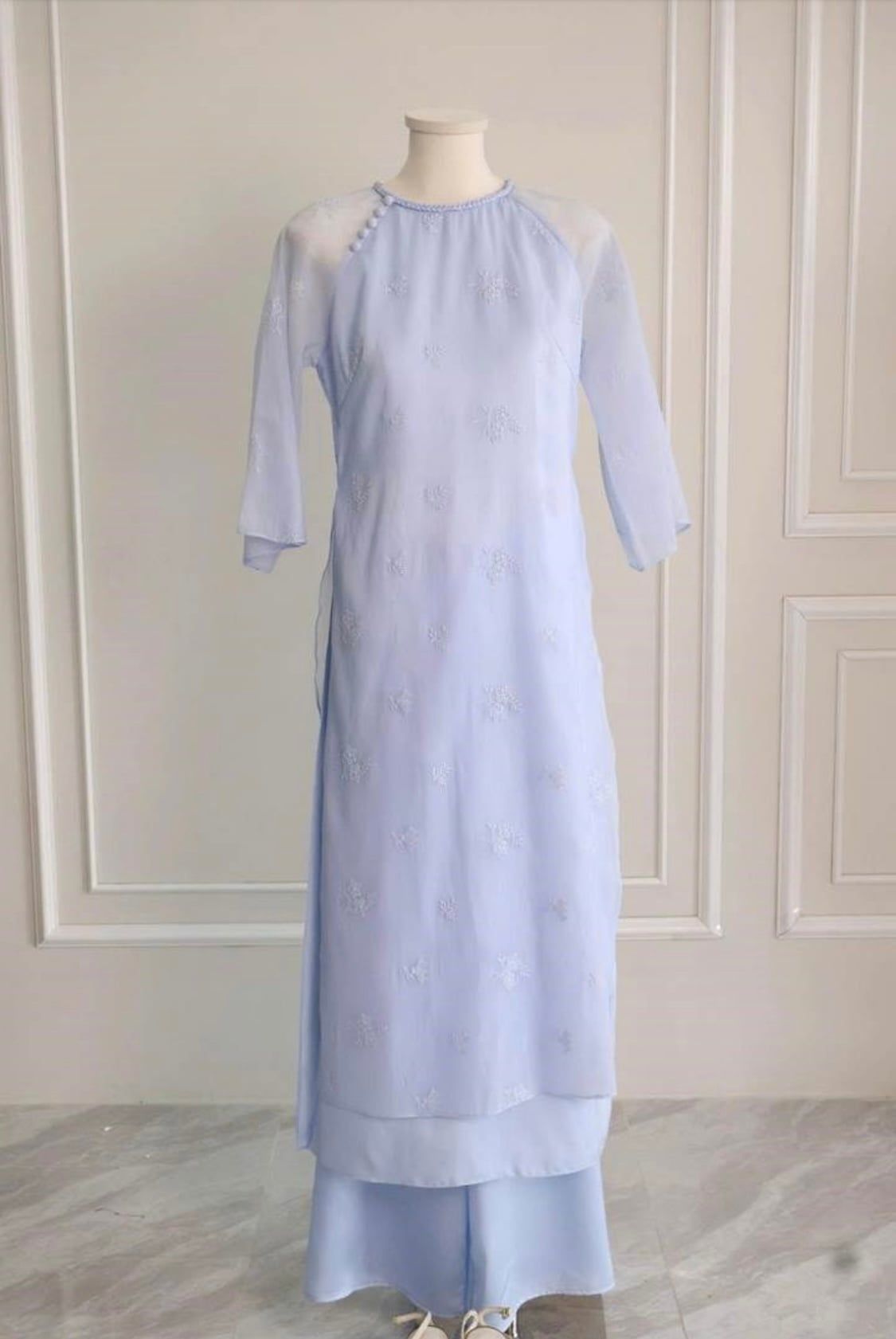 W - Áo dài xanh dương tay dài cổ đính nơ KOALIFY