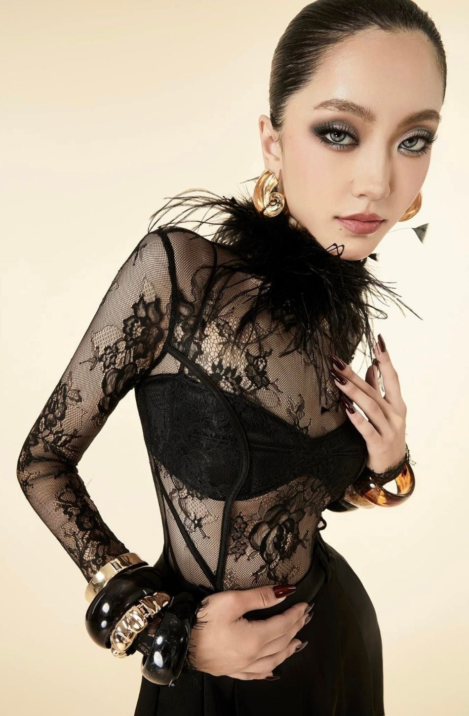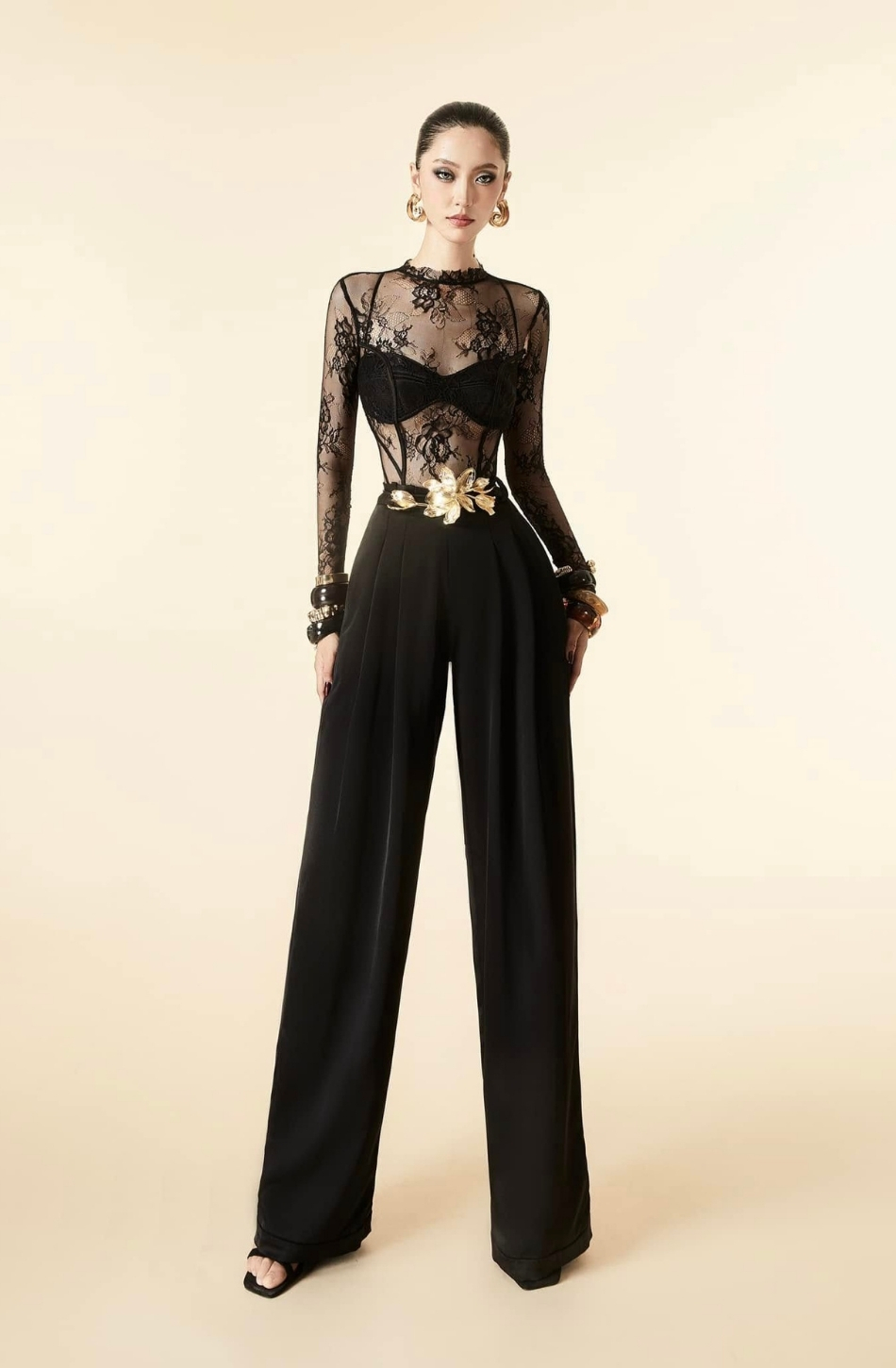 Set 4 món áo lưới bra quần tây đen dài và chùm lông trên cổ MAEL FEMME