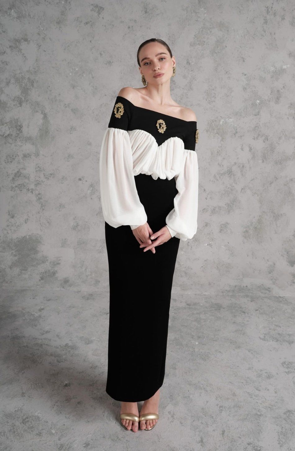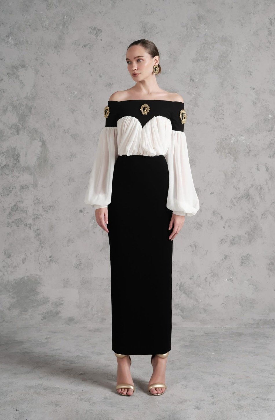 DANG PASS - Set áo bẹt vai phối tay trắng kèm chân váy đen CHAU PHAM