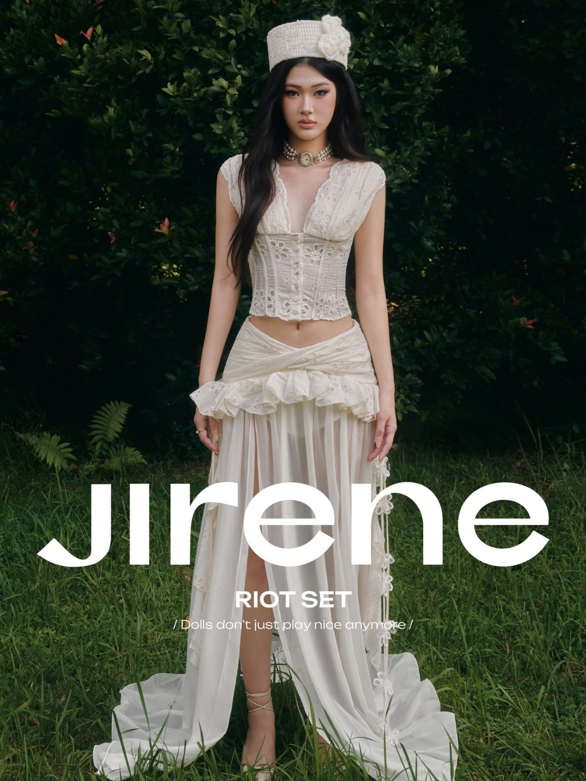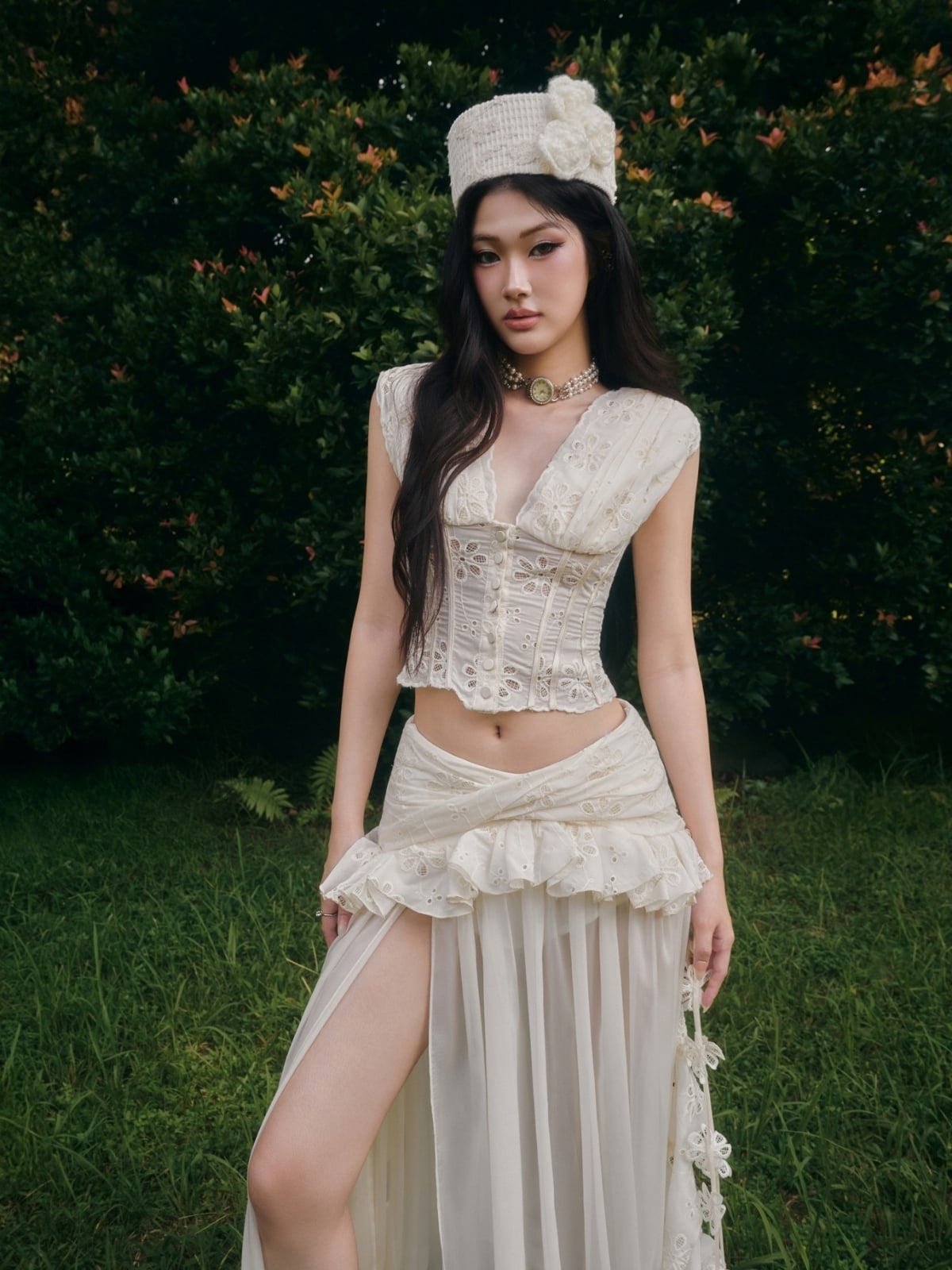 W - Set áo croptop và chân váy dài trắng kèm mũ JIRENE