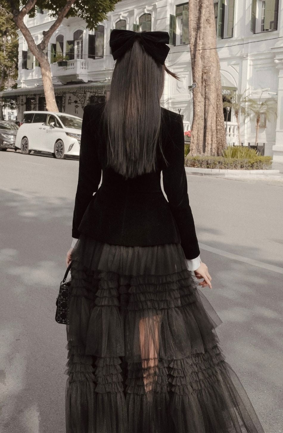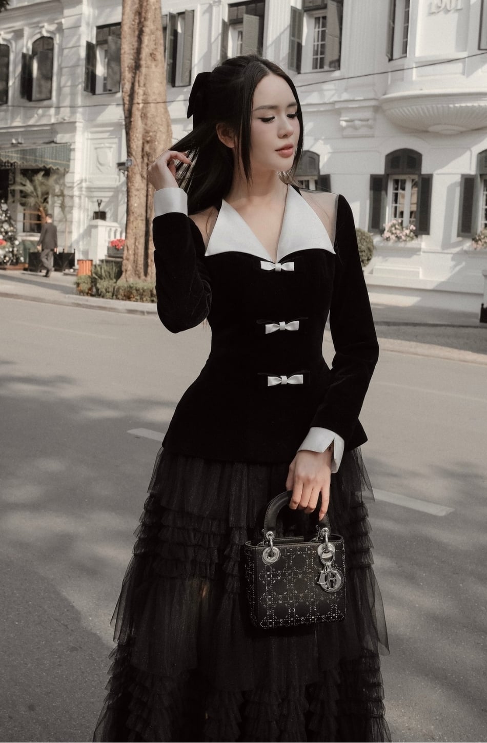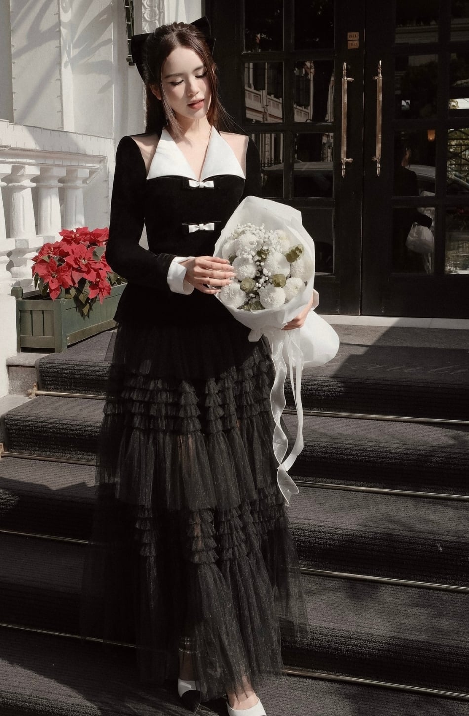 Set áo đen nơ trắng và chân váy tầng DELICATE