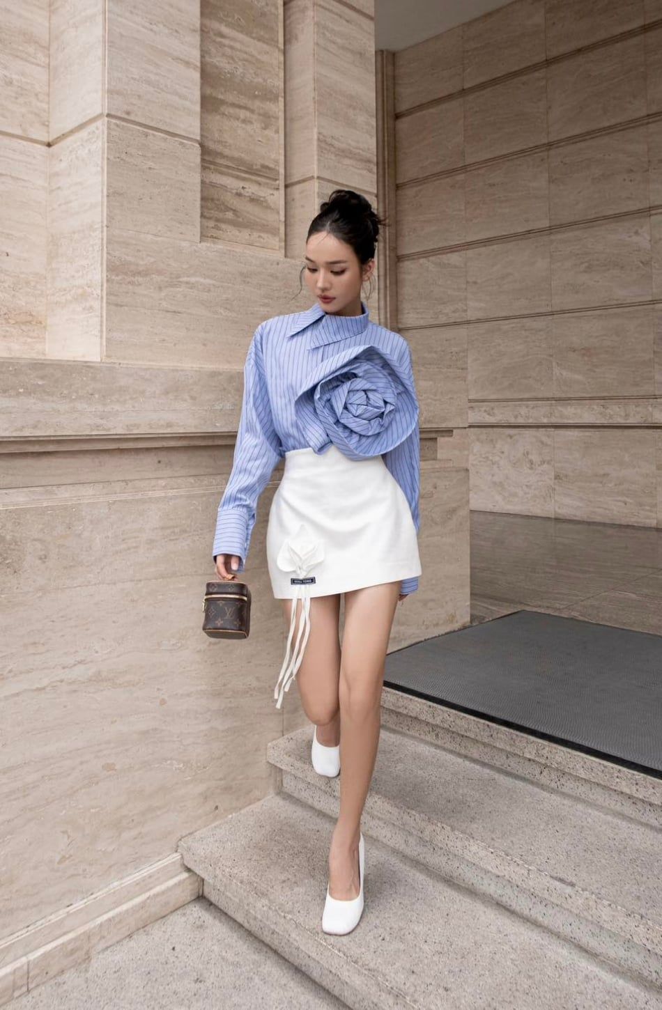 Set áo sơ mi xanh dương kèm chân váy trắng ngắn KEIRA TONG