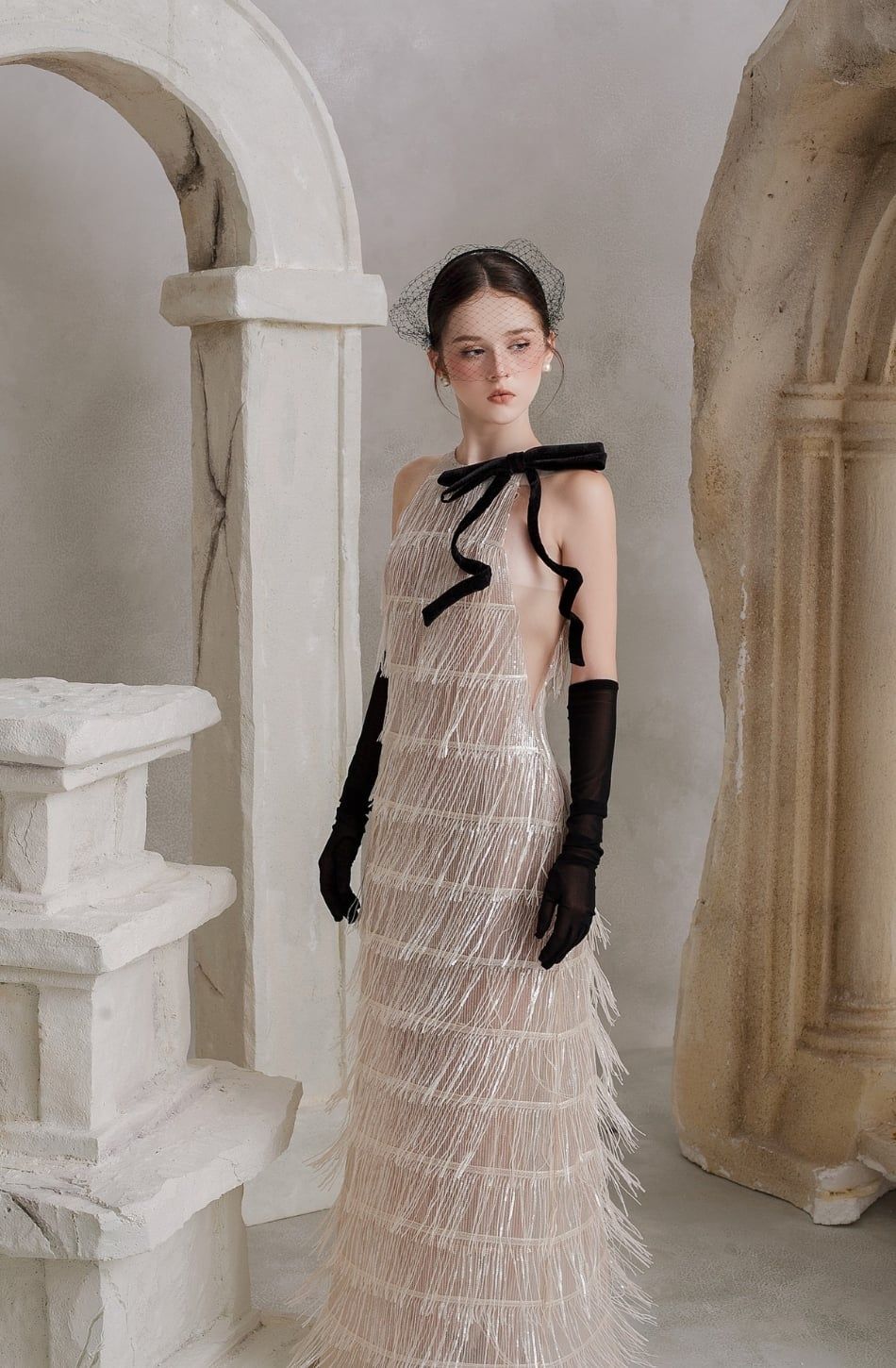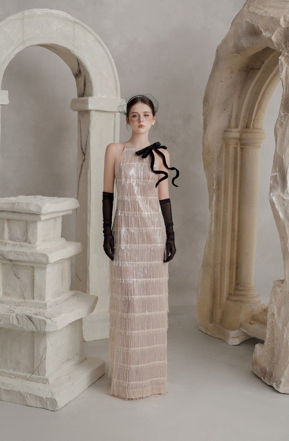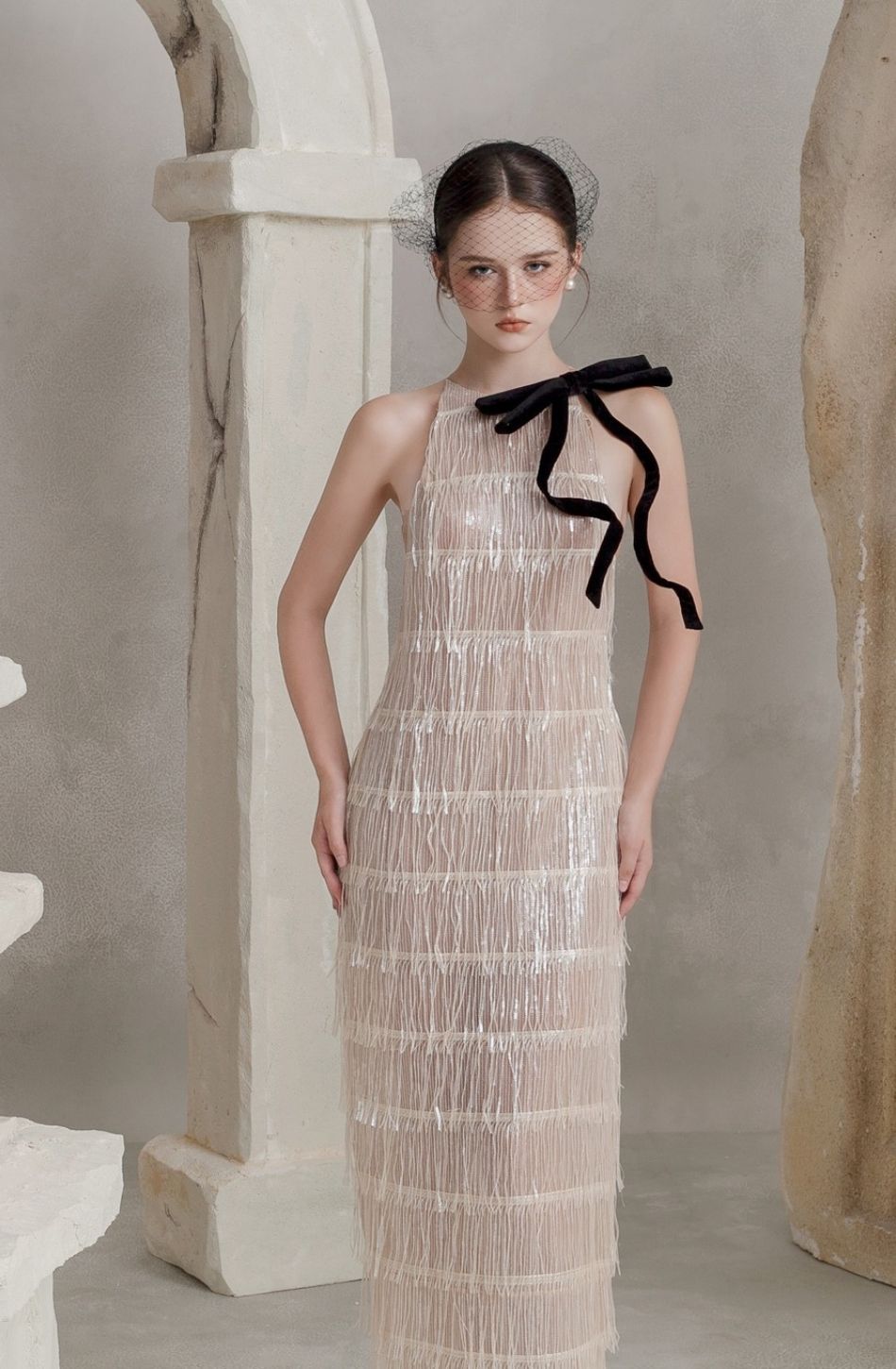 Váy bạc dài tua rua kèm nơ đen BELOVED