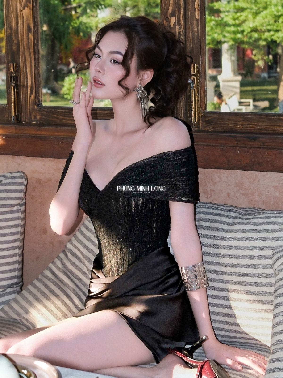 Váy đen bẹt vai cổ chữ V chân váy lụa LONGNG