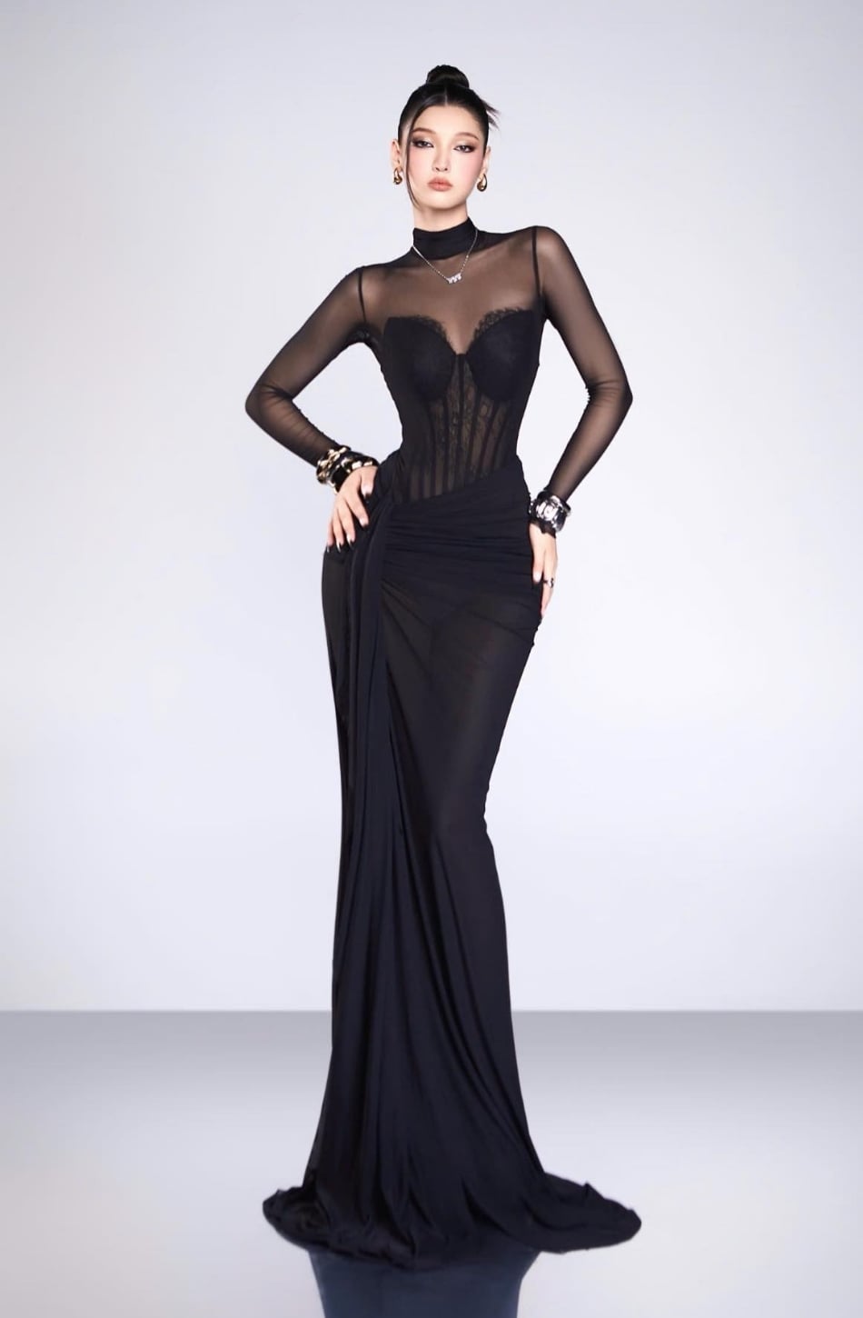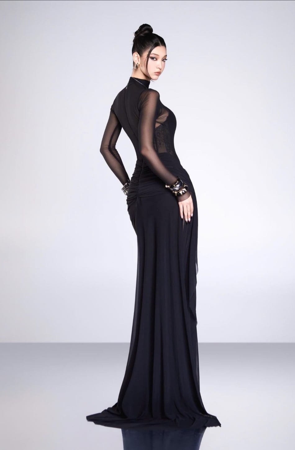 Váy đen tay lưới dài tà lụa dài BANDAGE DRESS