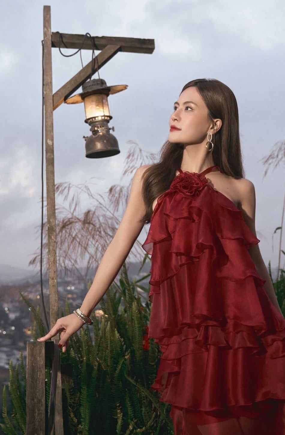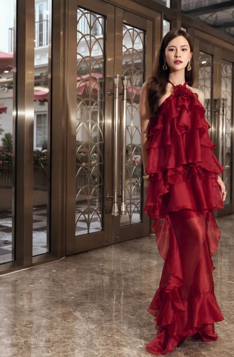 Váy đỏ dài cổ yếm đính bông hồng MUST HAVE