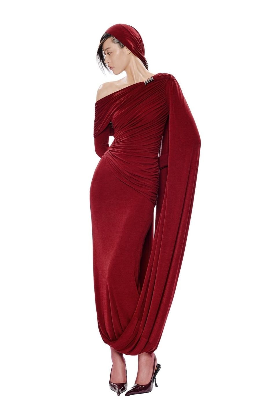 Váy đỏ dài ôm body lệch vai 1 bên CHATS