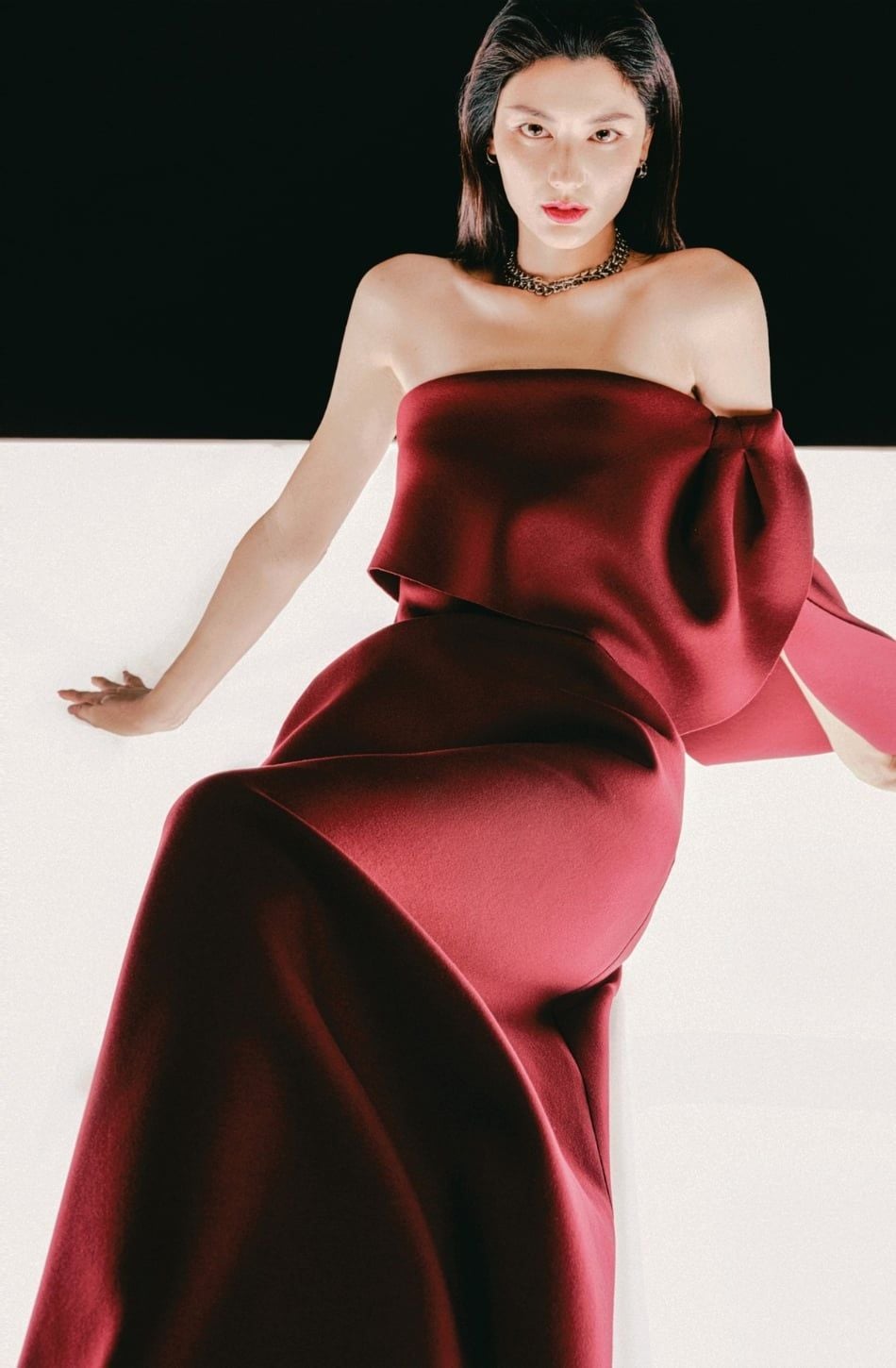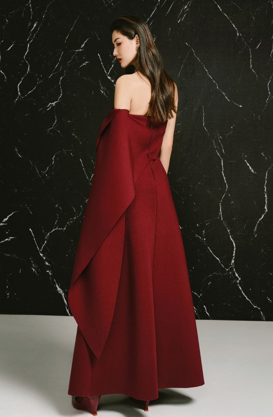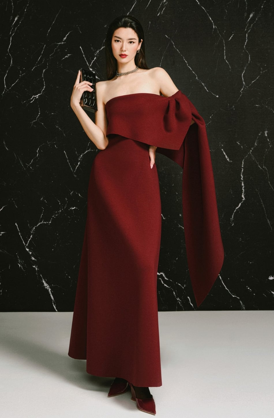 Váy đỏ dài vạt kiểu dài 1 bên tay LANE JT