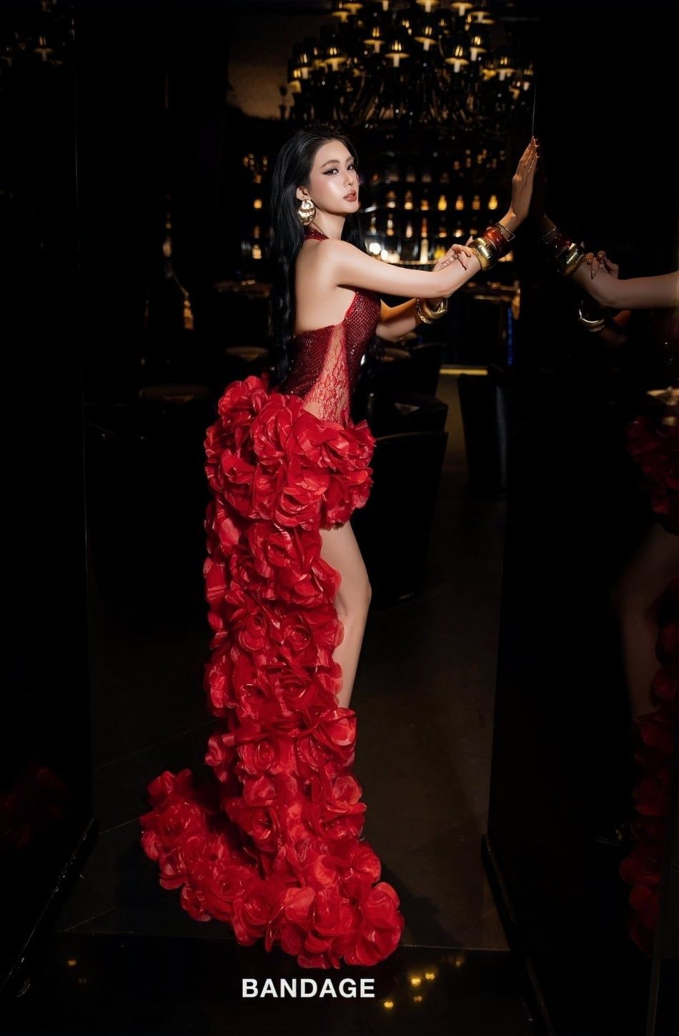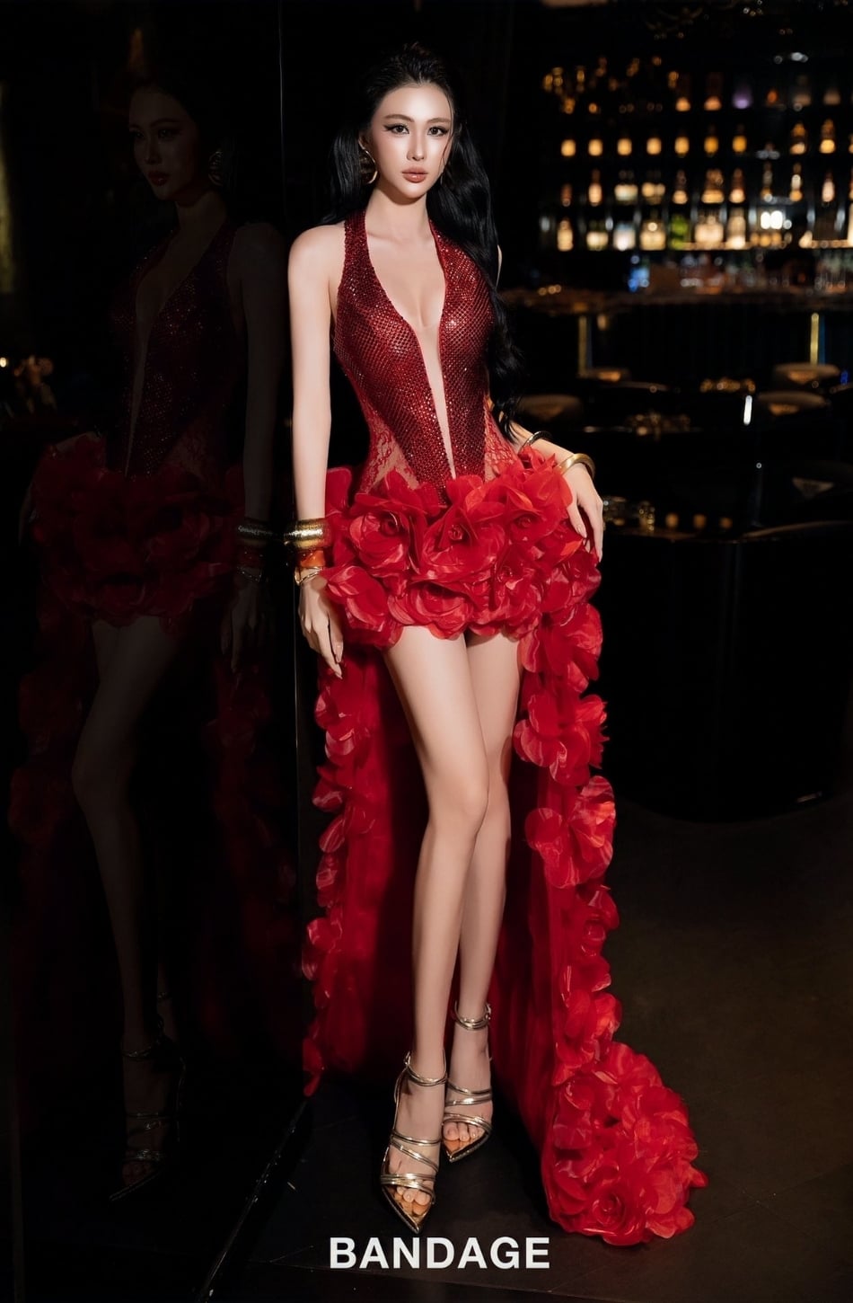Váy đỏ đính đá tà dài khoét chân BANDAGE DRESS -CÓ 2C