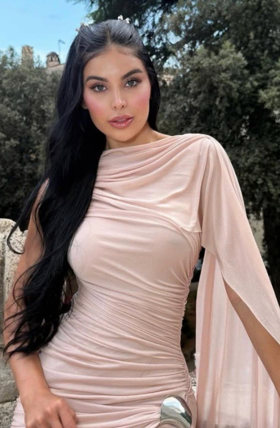 Váy hồng body vạt dài chéo 1 bên vai CHATS