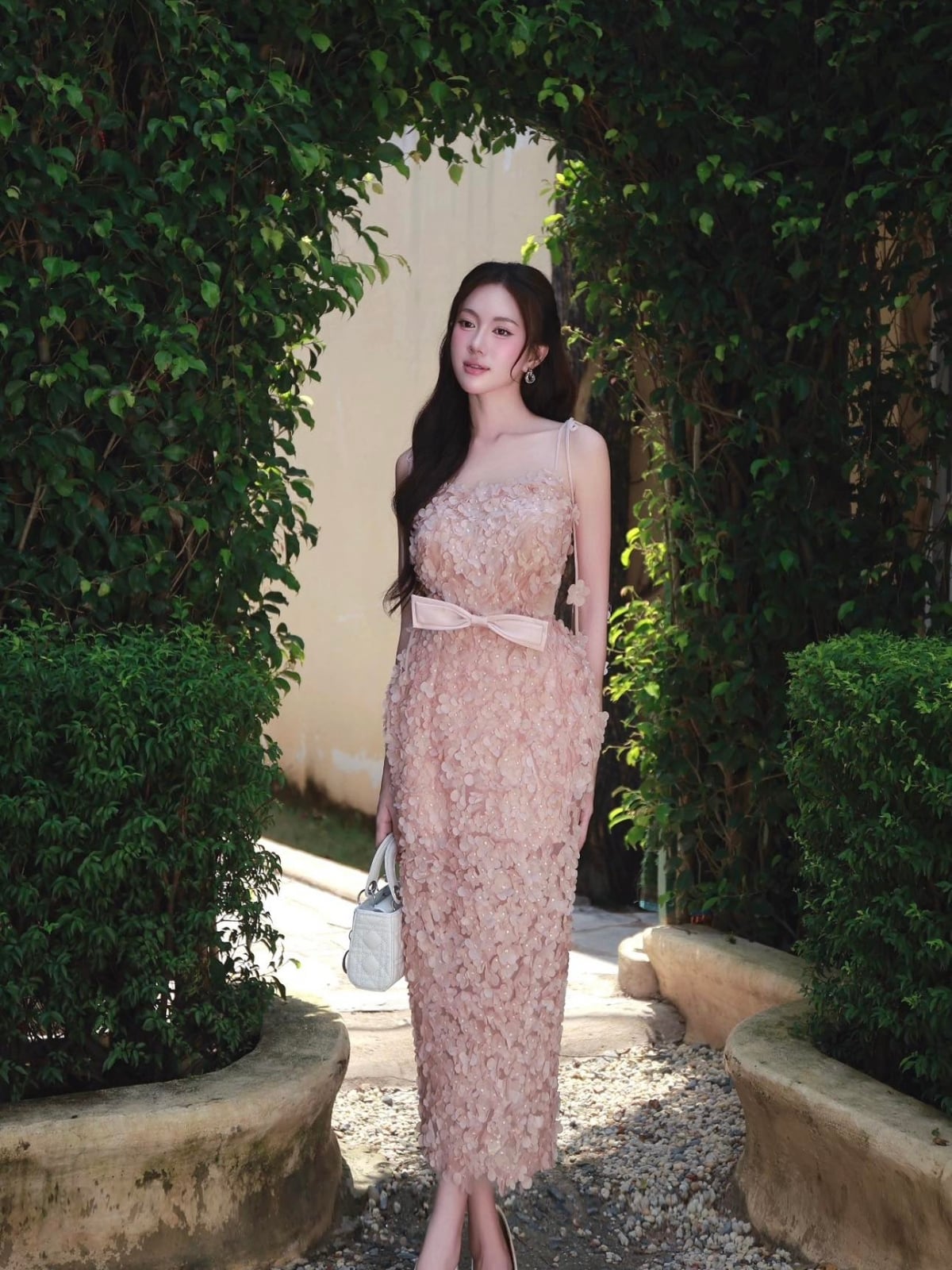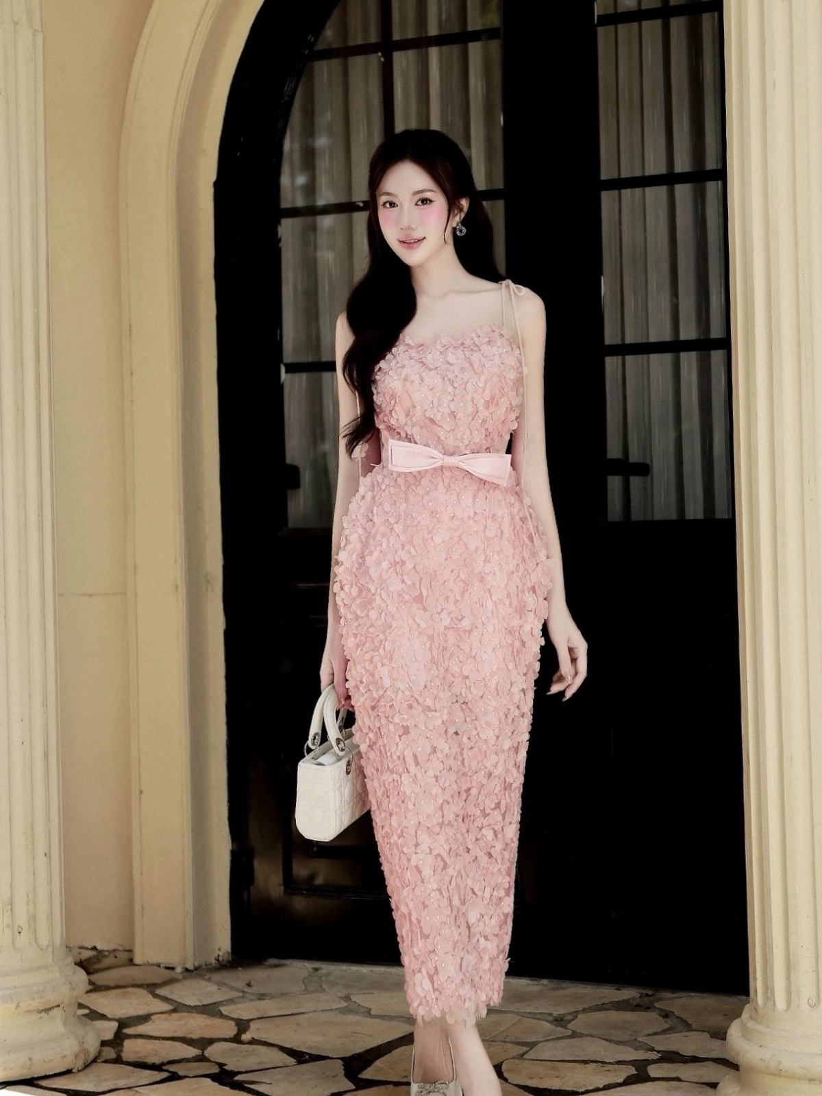 Váy hồng dài đính nơ ngay eo XYBYMY XY