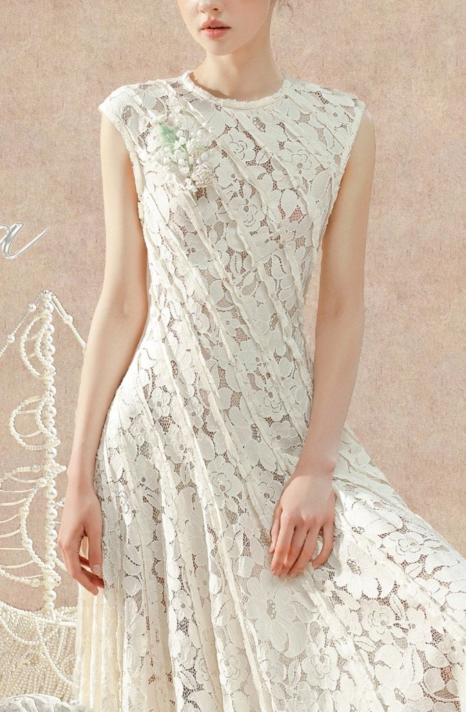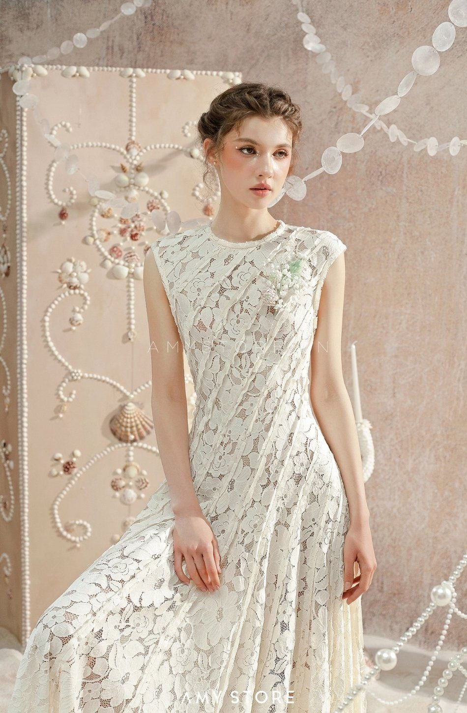 Váy kem dài sát nách vải ren AMY STORE