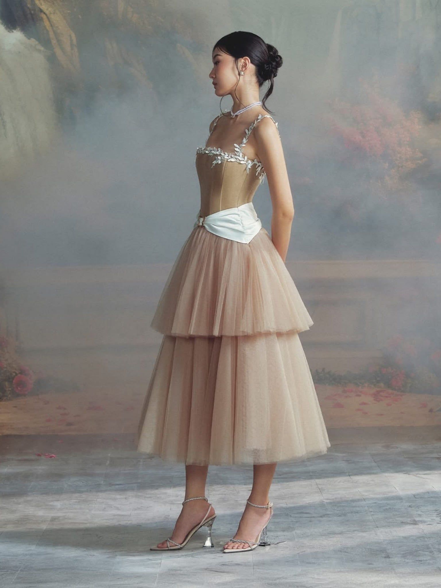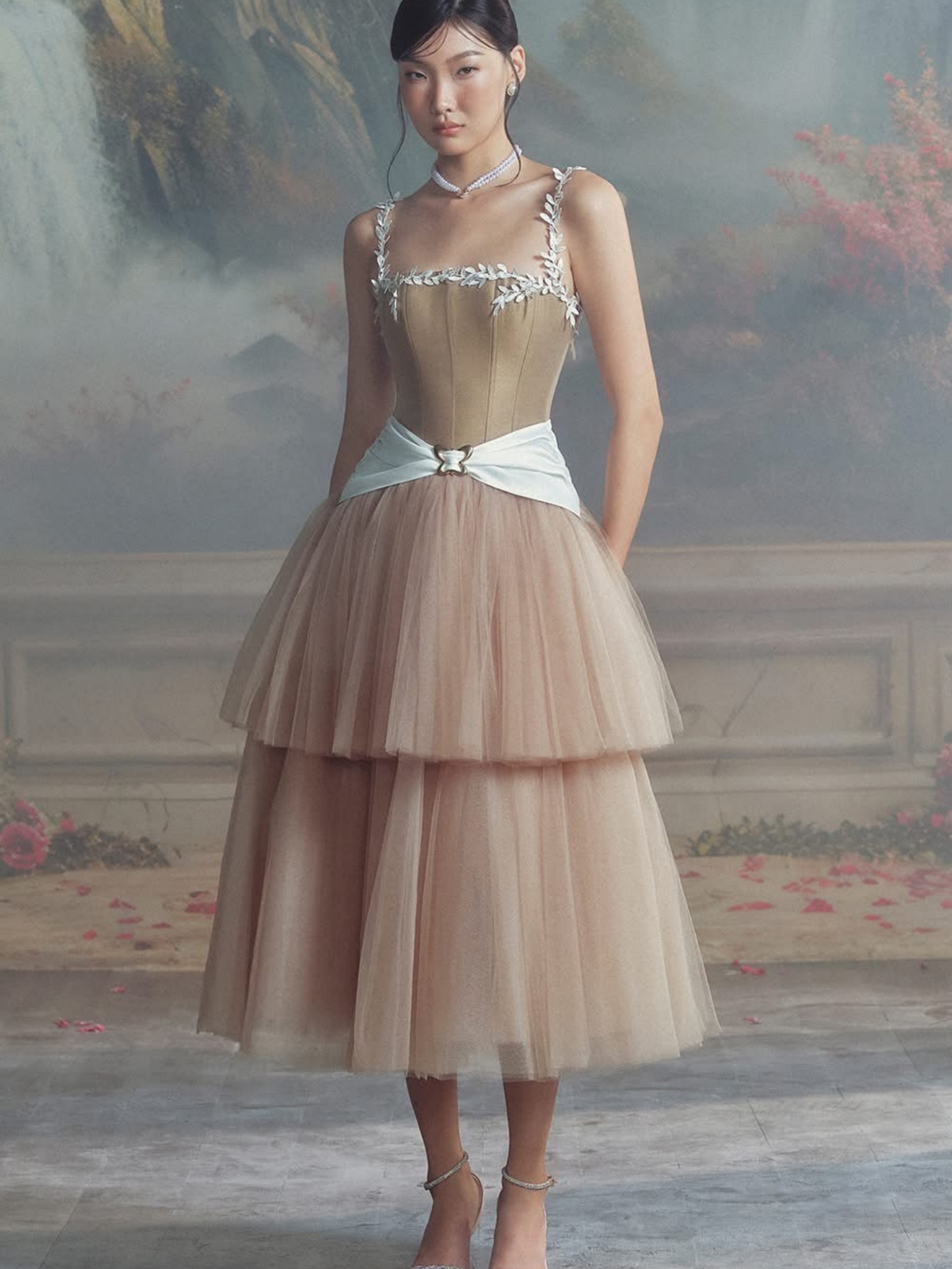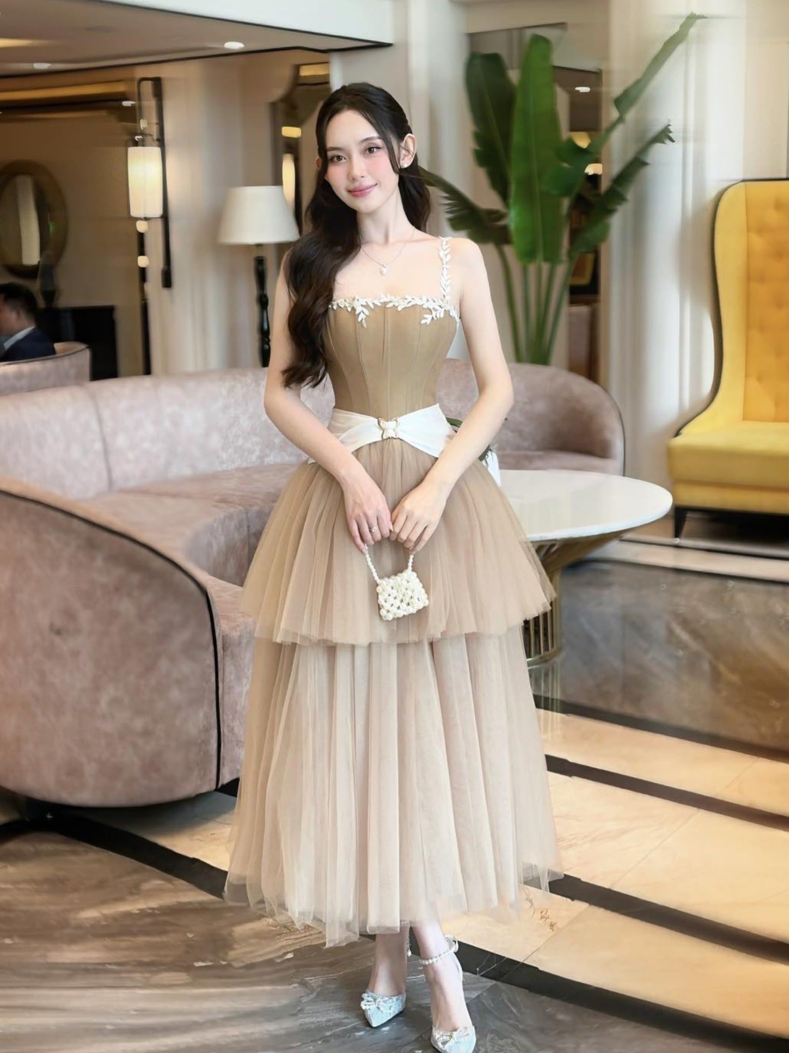 Váy nâu dài 2 dây trắng ren thắt nơ trắng ngay eo LINH PHUNG