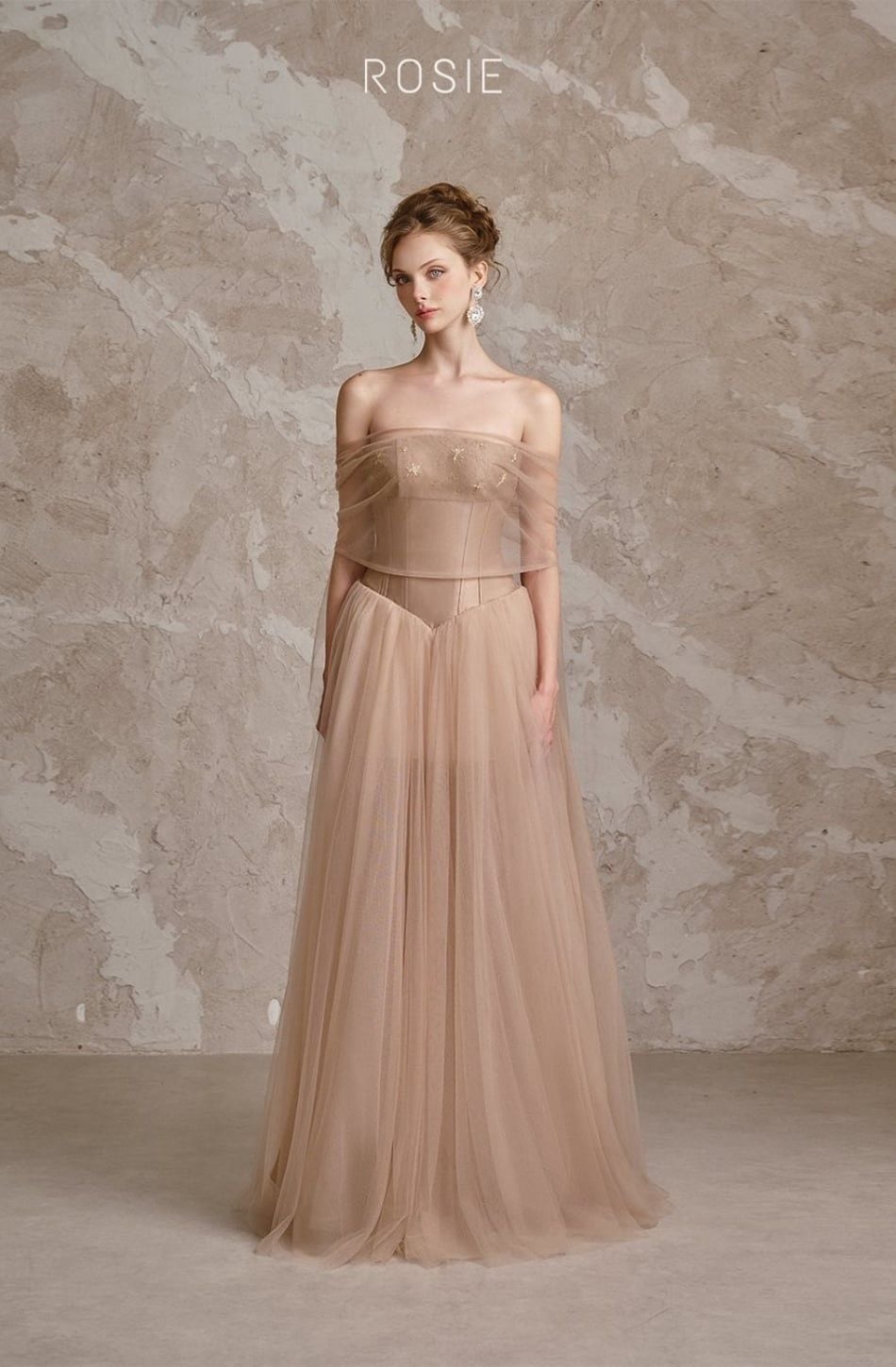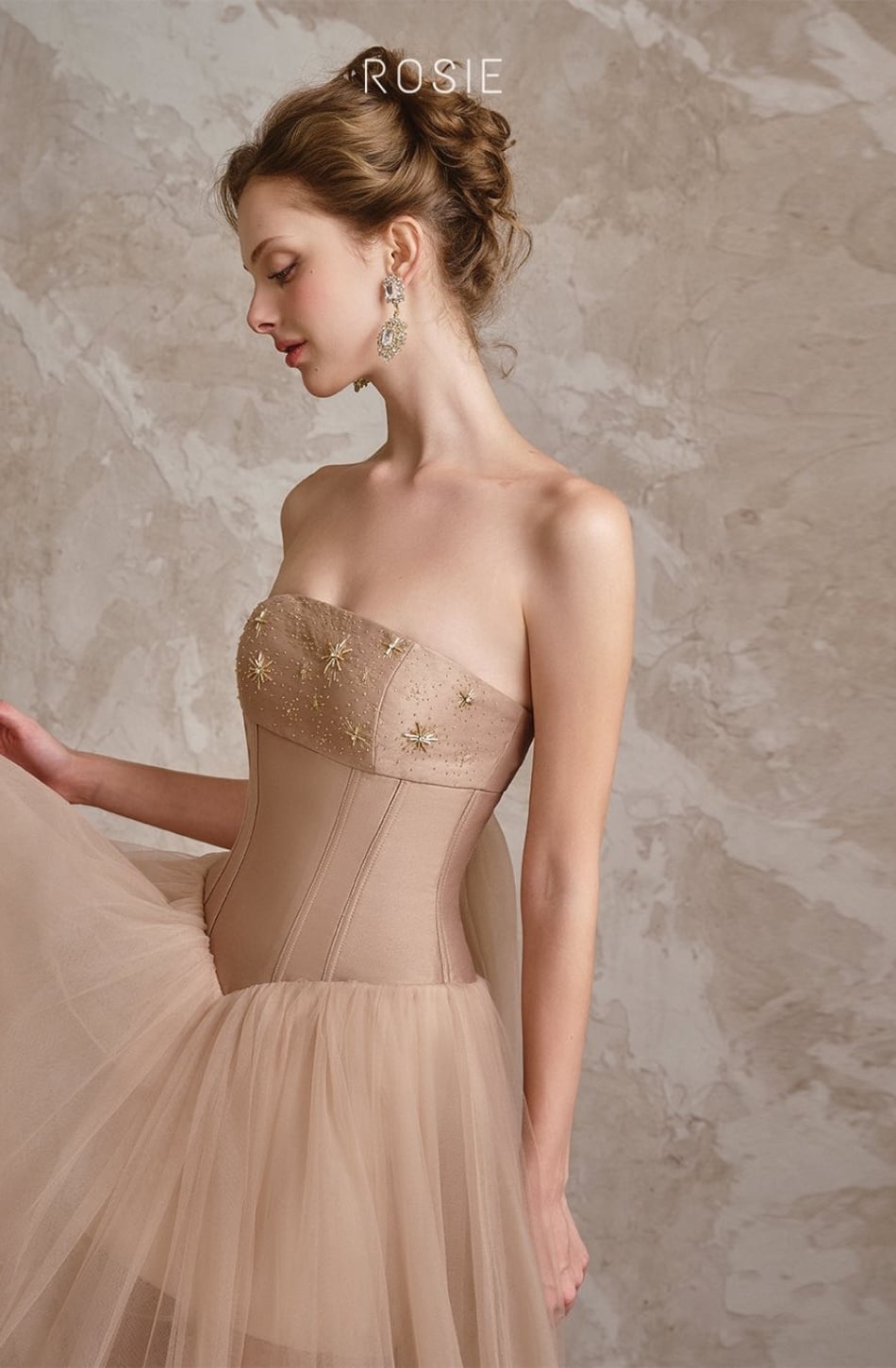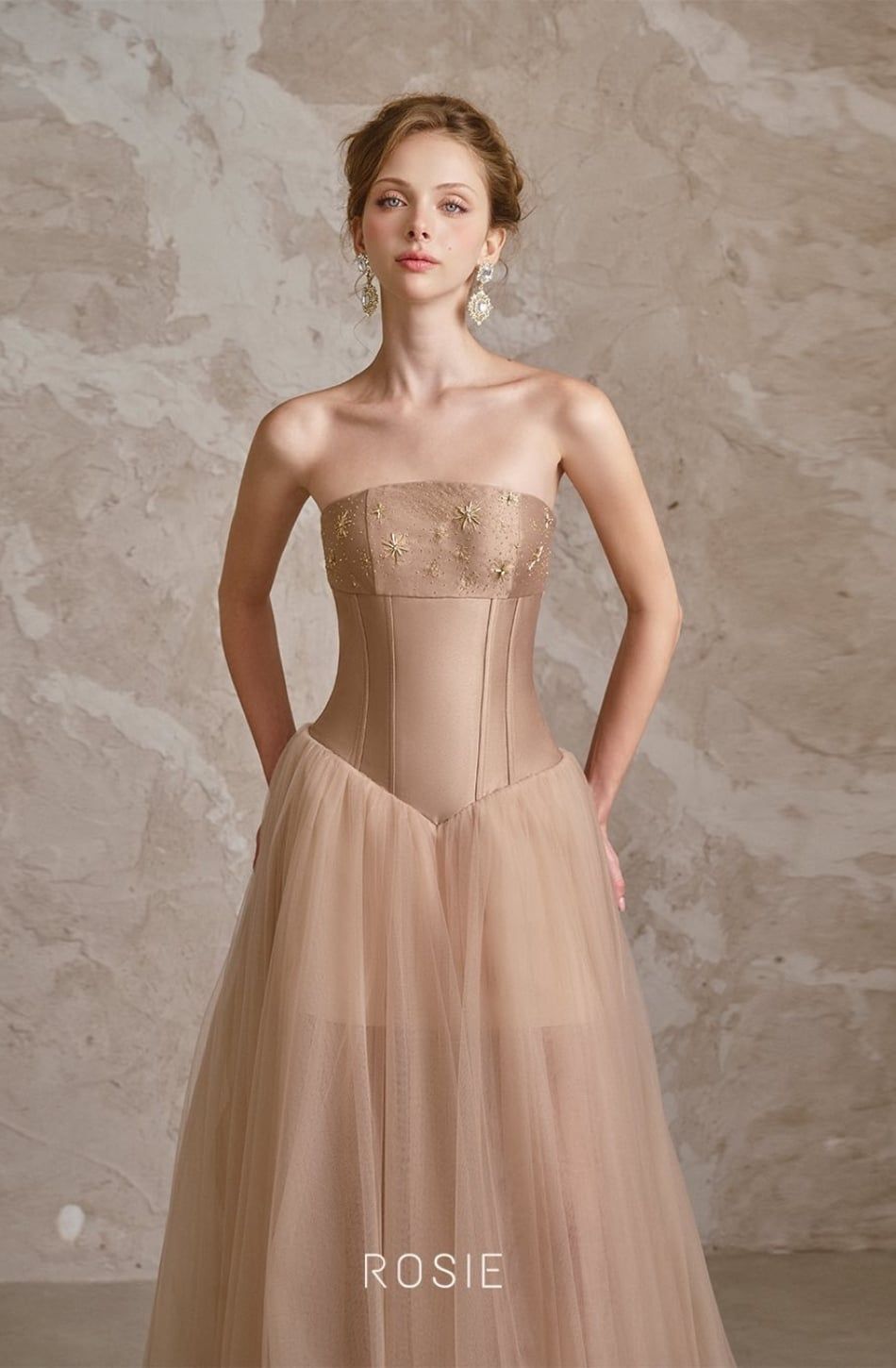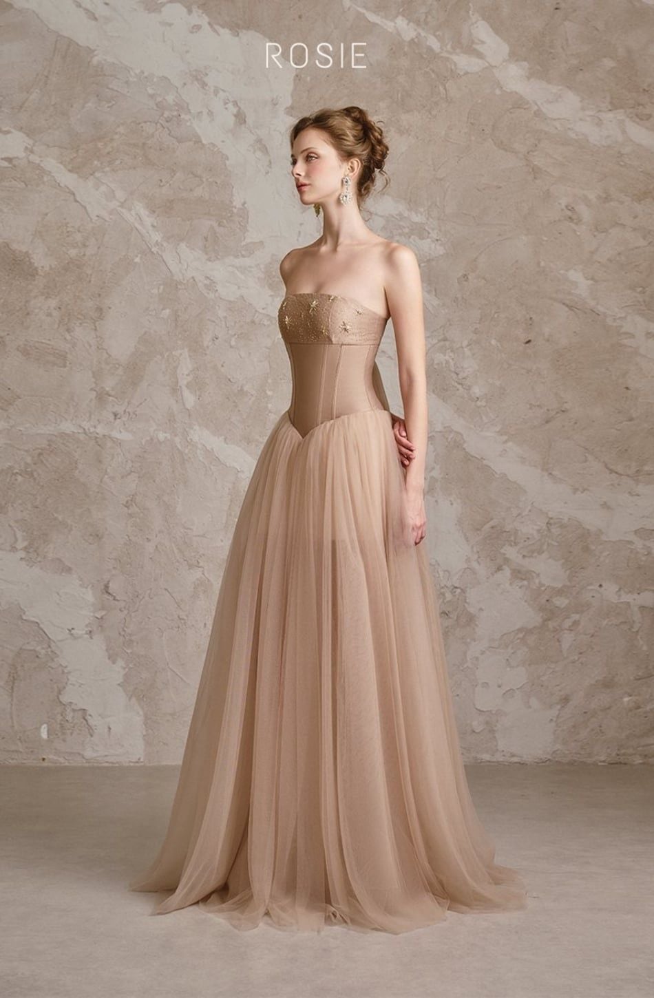 Váy nâu dài cúp ngực tà lưới ROSIE