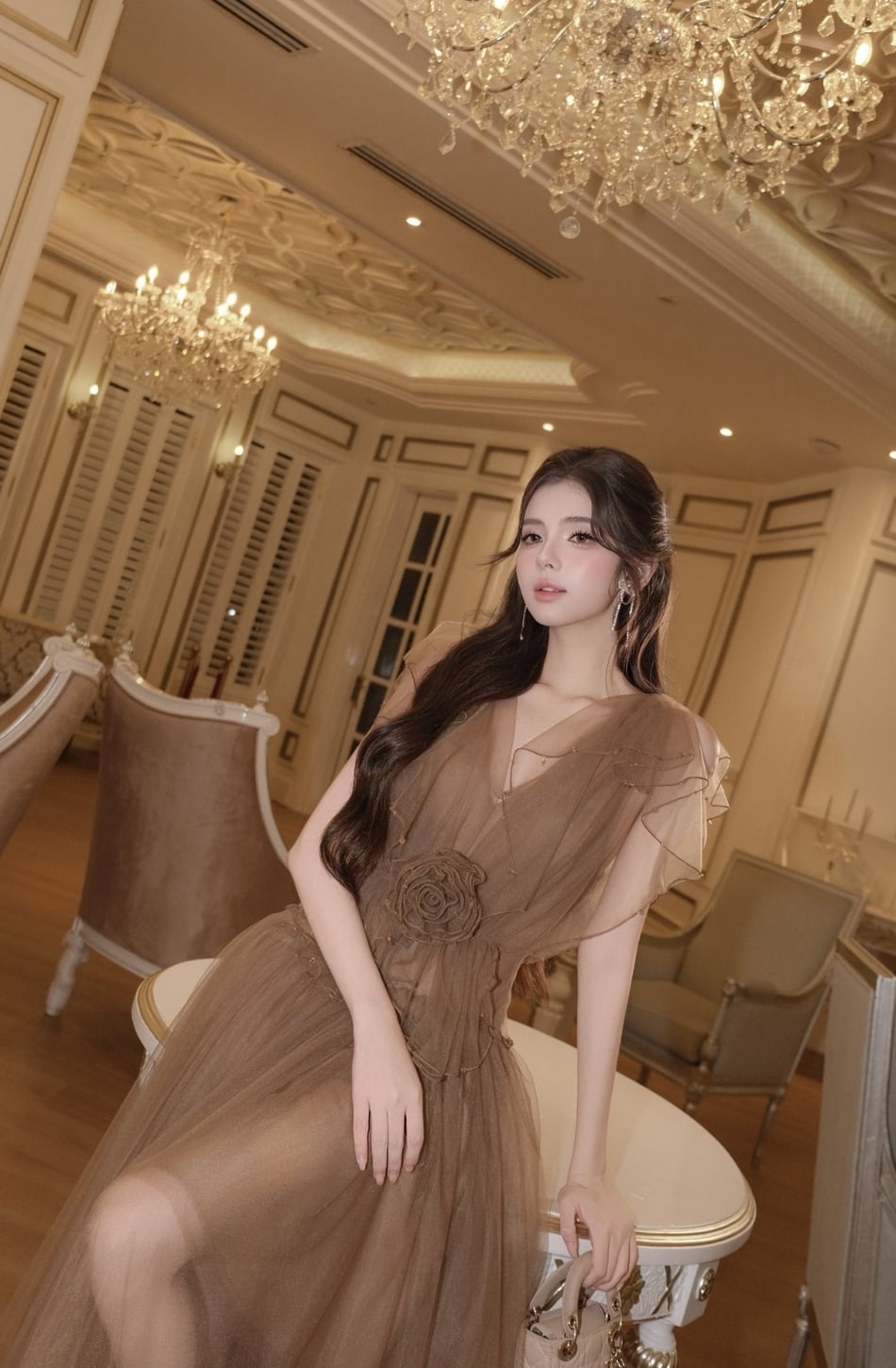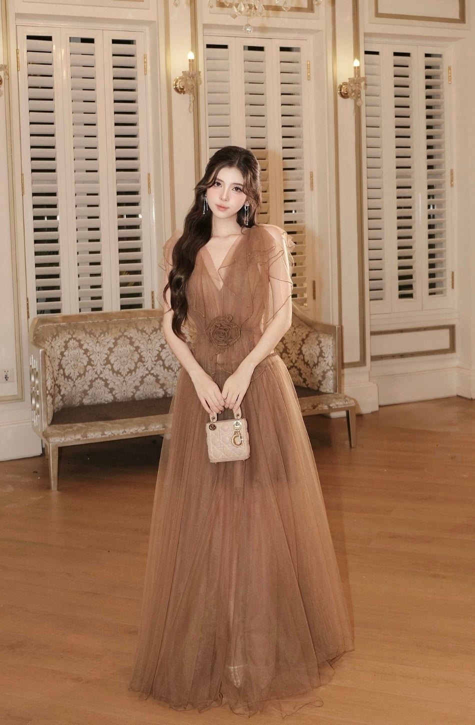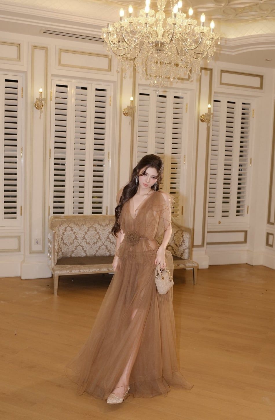Váy nâu dài xẻ ngực tay áo cánh tiên XYBYMY XY