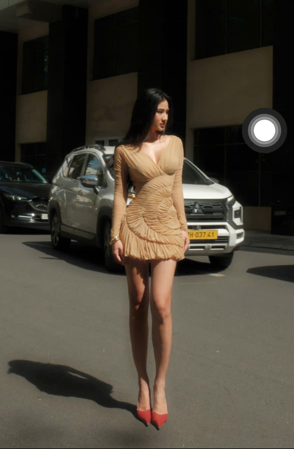 Váy nâu ngắn tay dài cổ chữ V ôm body DATT