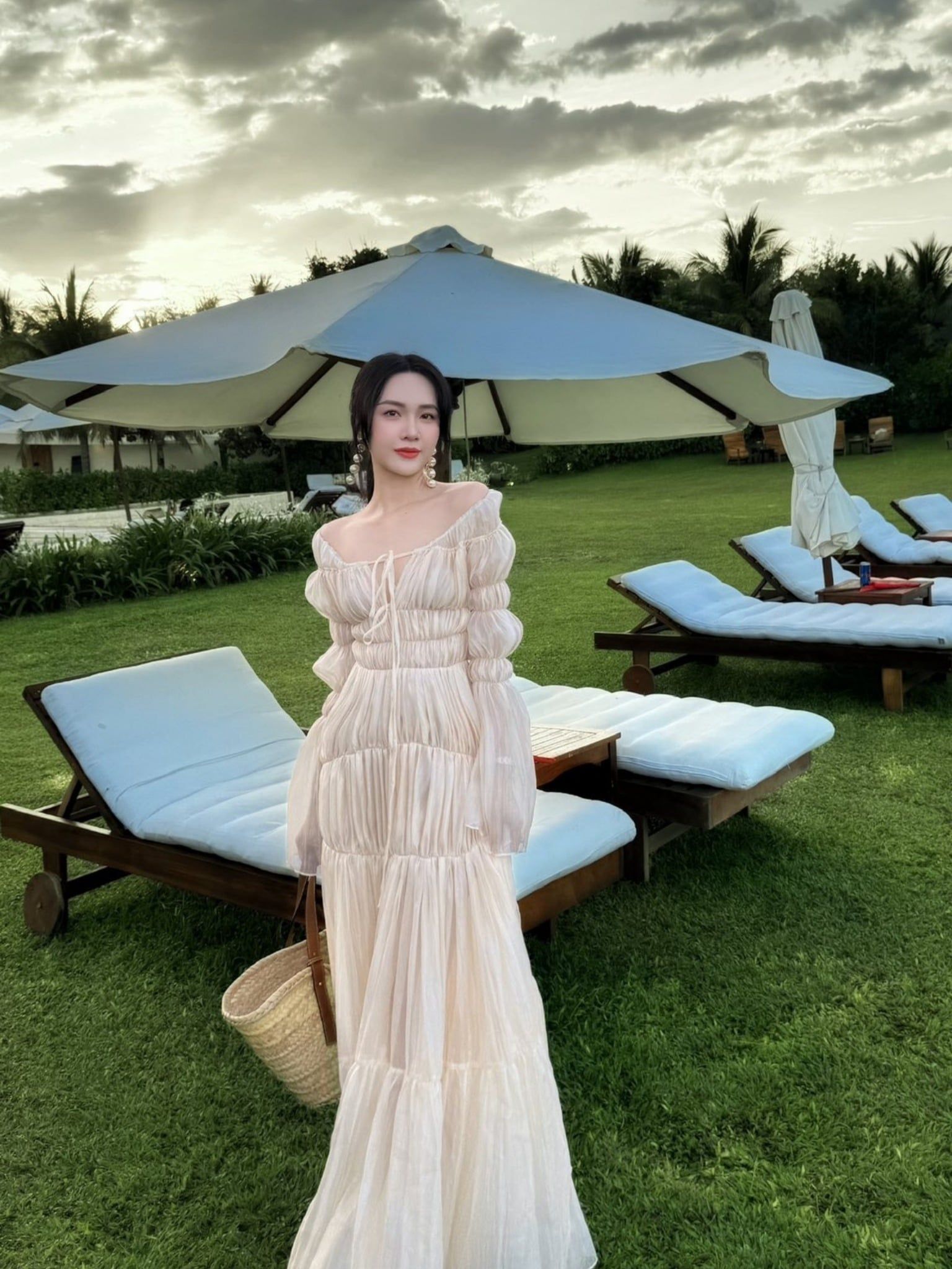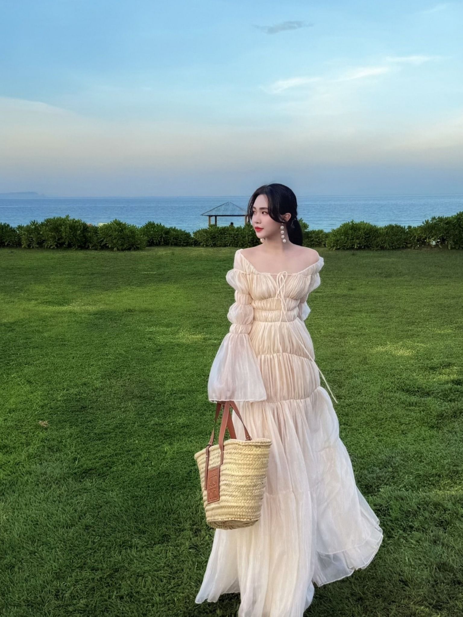 Váy trắng bẹt vai tay ống loe LINH PHUNG