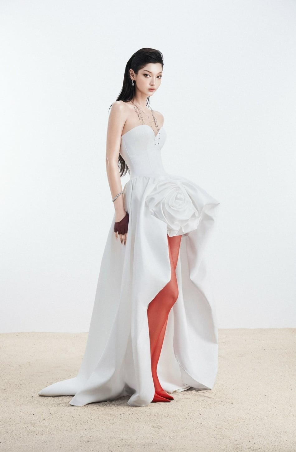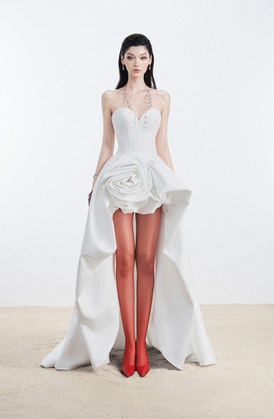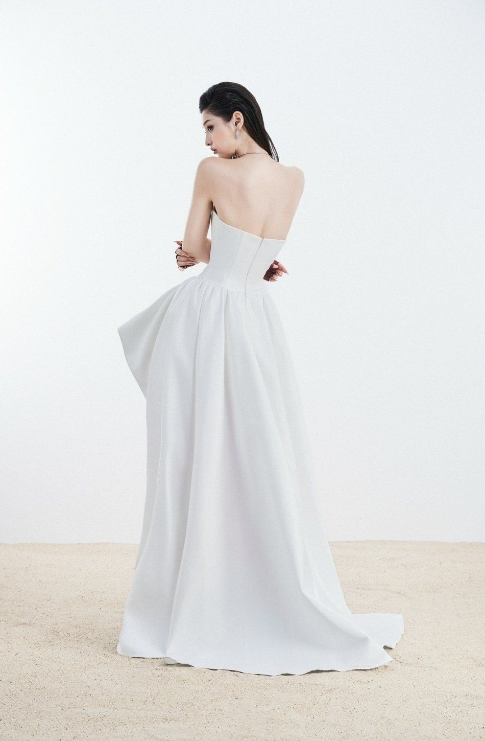 Váy trắng cúp ngực tà đính bông hồng GLAMDOLL