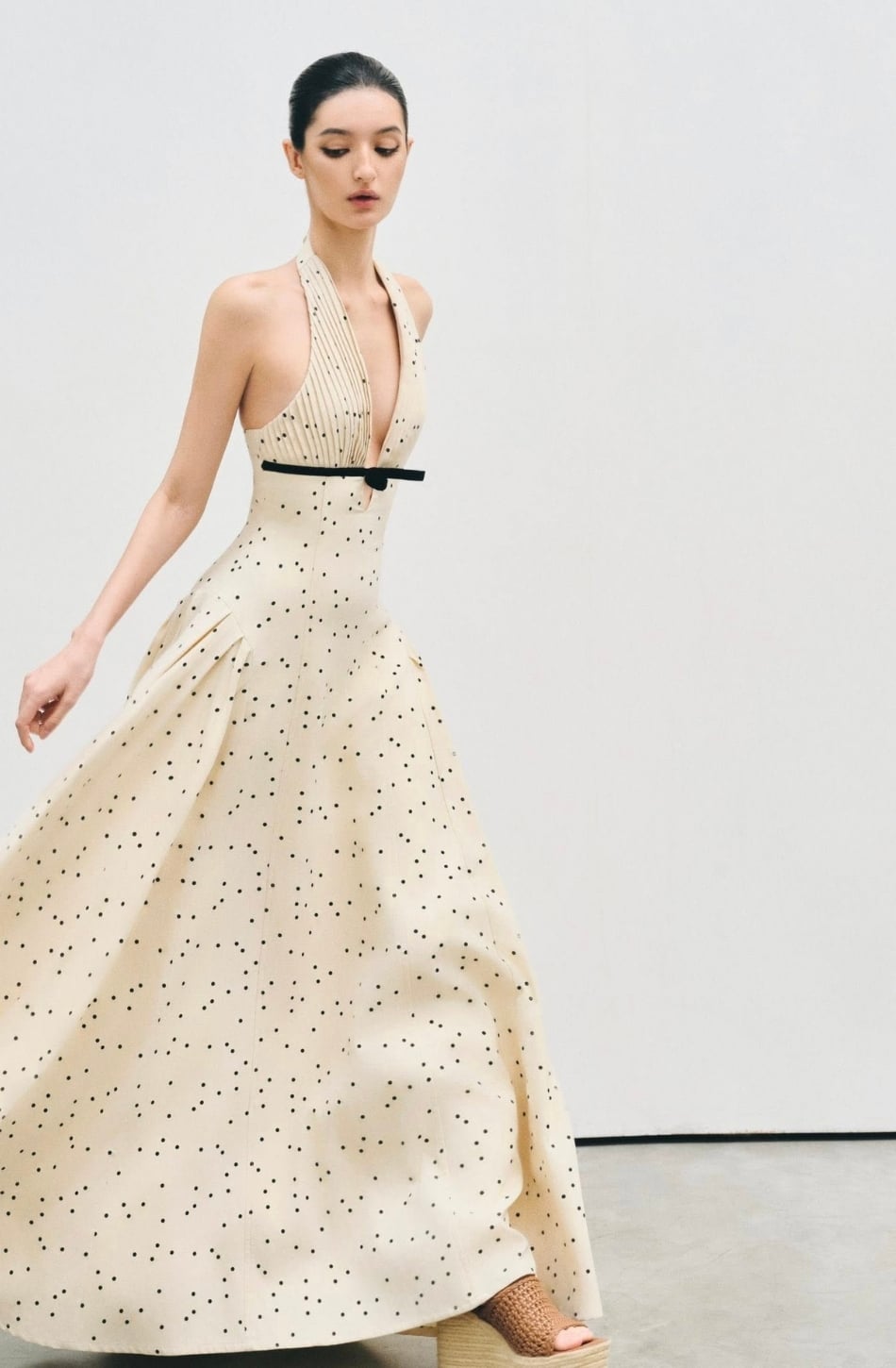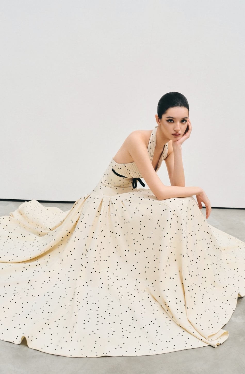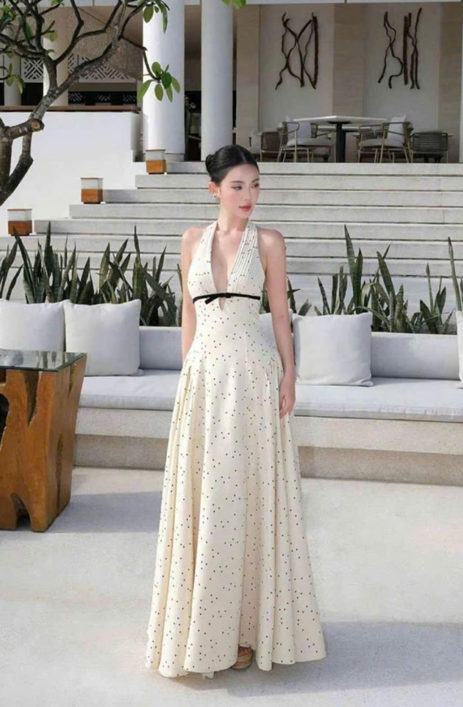 Váy trắng dài chấm bi khoét ngực đính nơ đen giữa ngực ONONMADE
