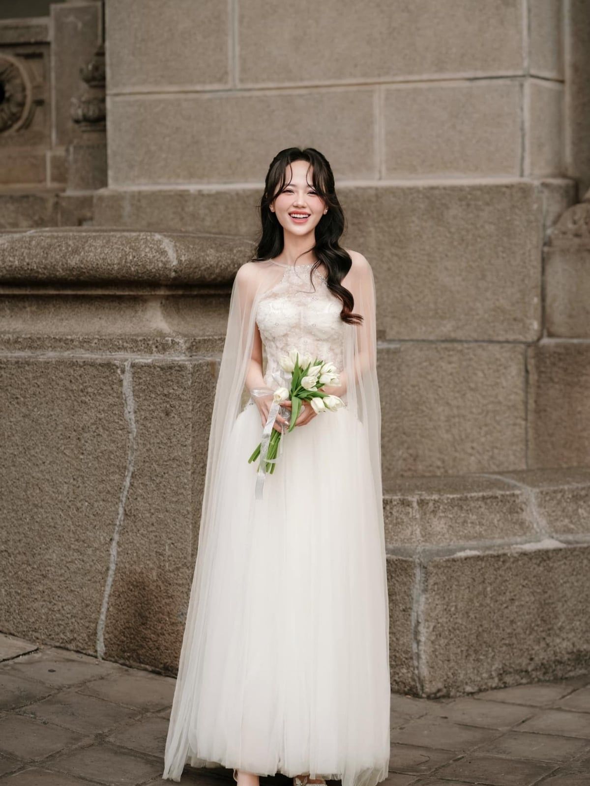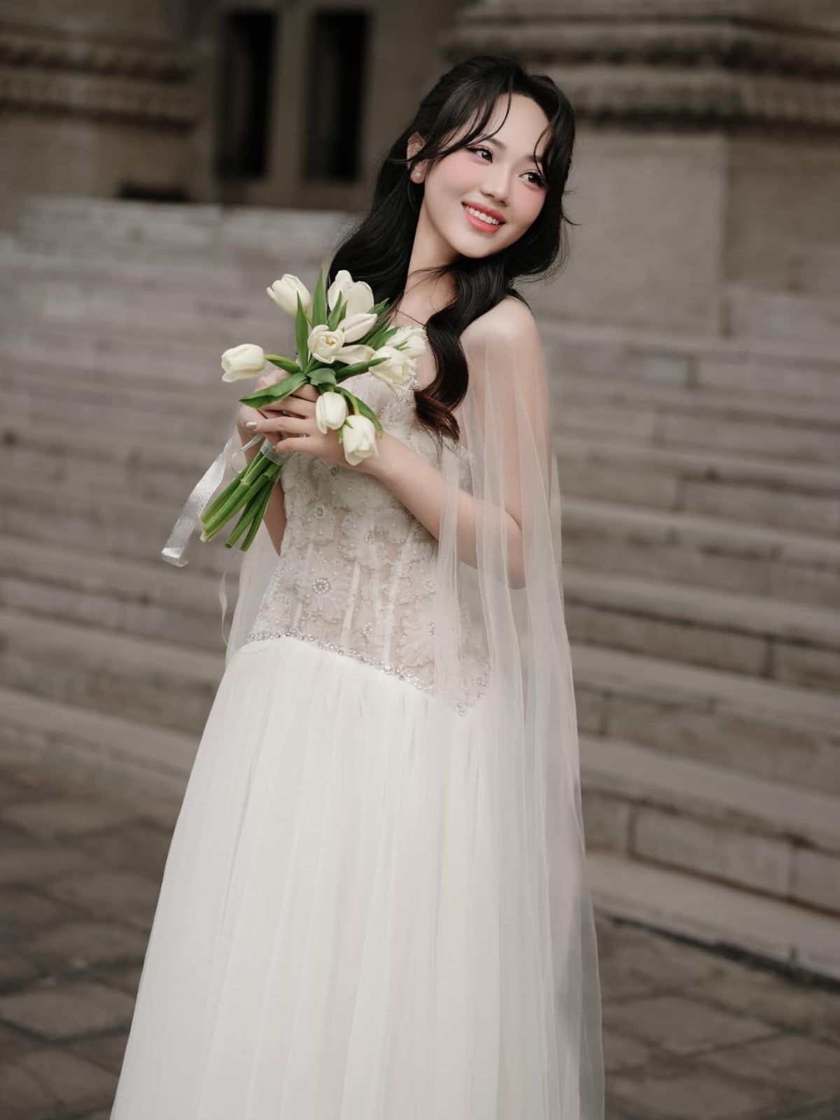 Váy trắng dài tà lưới phồng LINH PHUNG