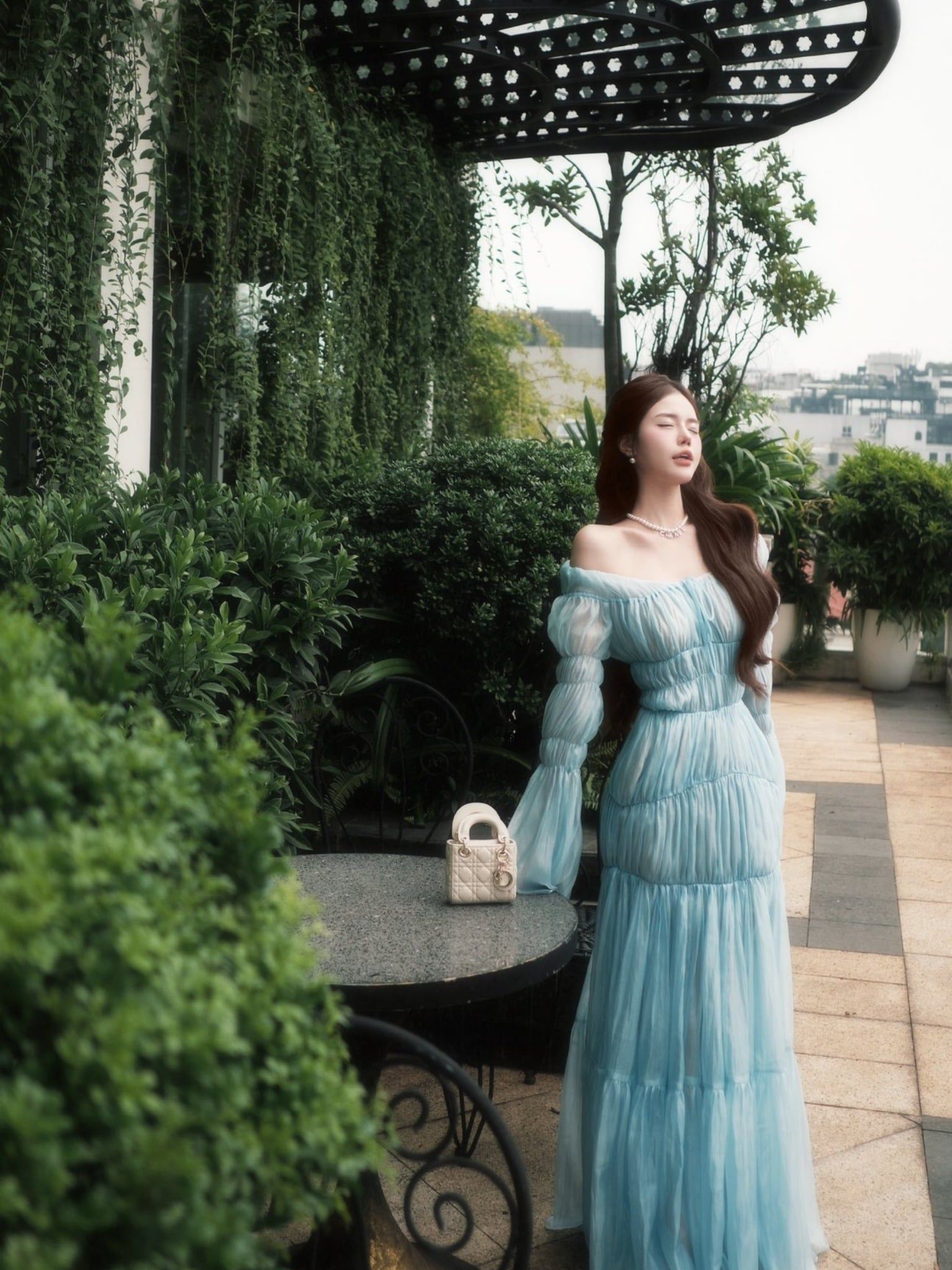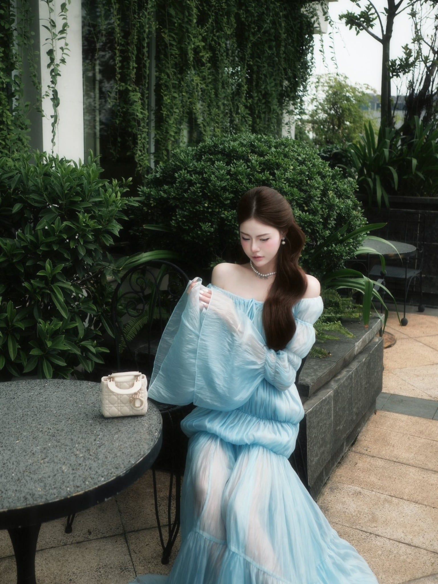 Váy xanh bẹt vai tay ống loe LINH PHUNG