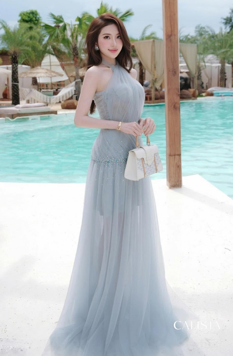 Váy xanh dương dài cổ yếm bản premium CASLITADEMINHTHANH