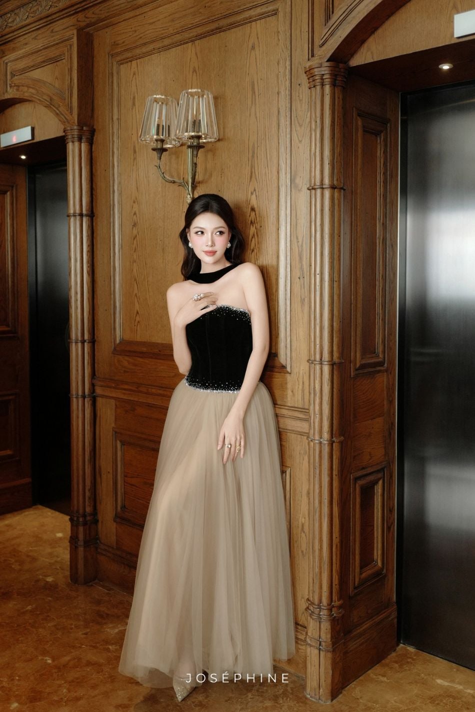 Váy dài tà nâu áo đen cúp ngực JOSEPHINE