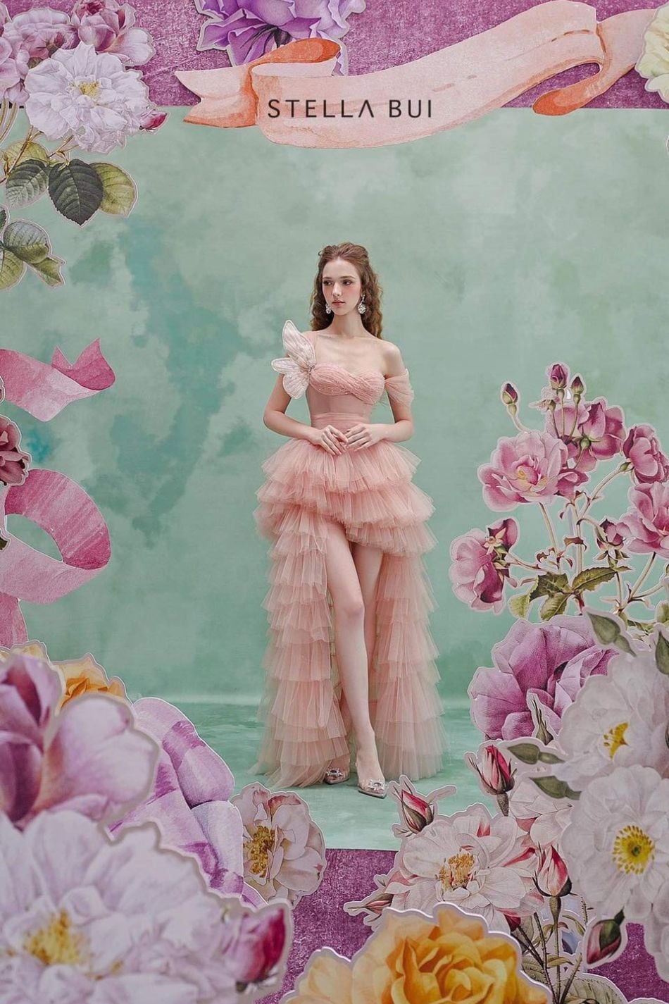 Váy hồng tầng đính cánh bướm bự bên ngực STELLA BUI