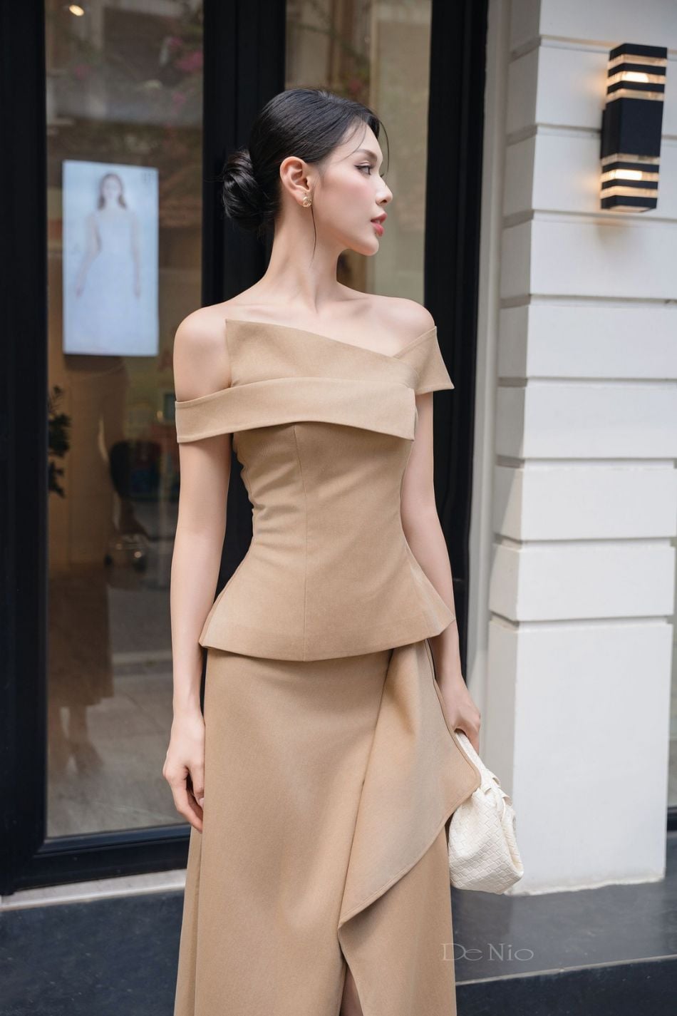 Váy nâu tay ngắn kèm dây thắt ngay lưng DENIO