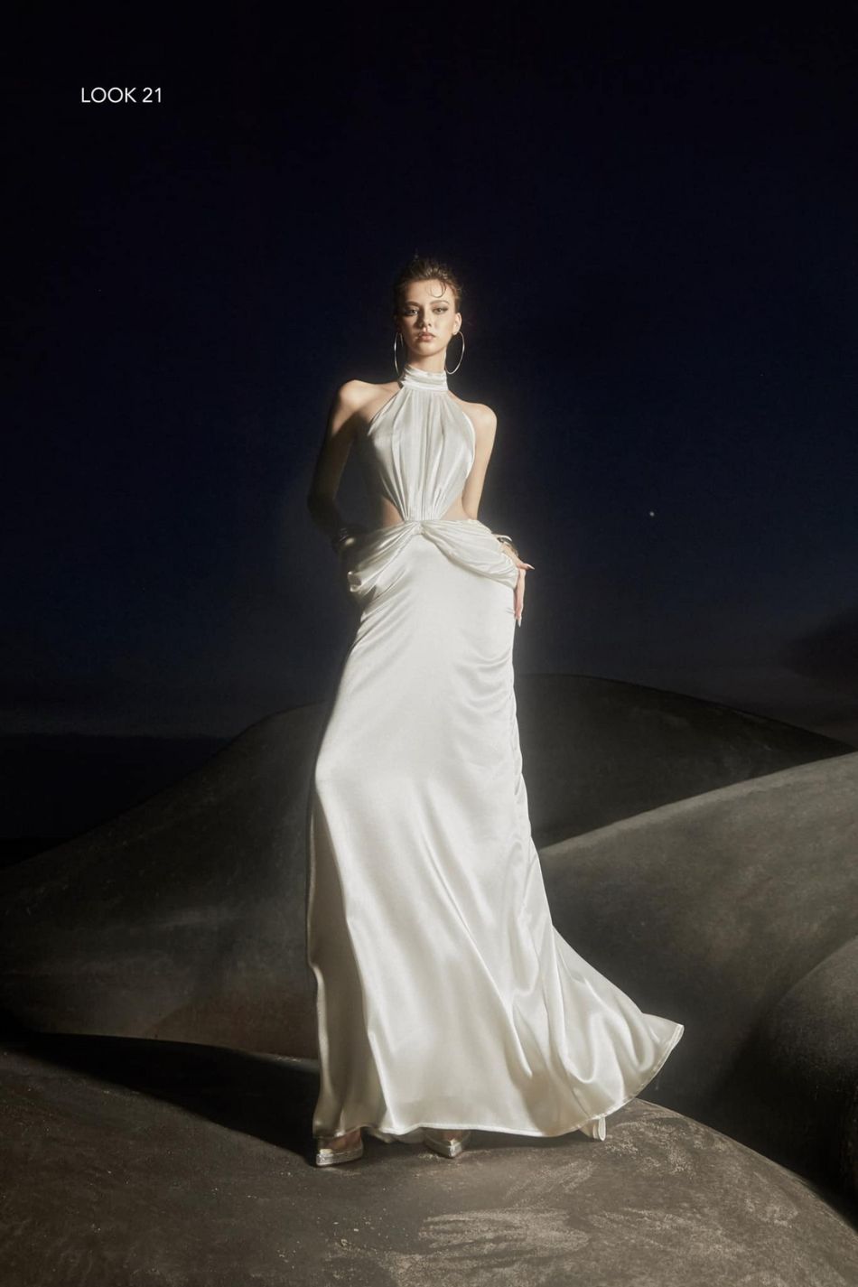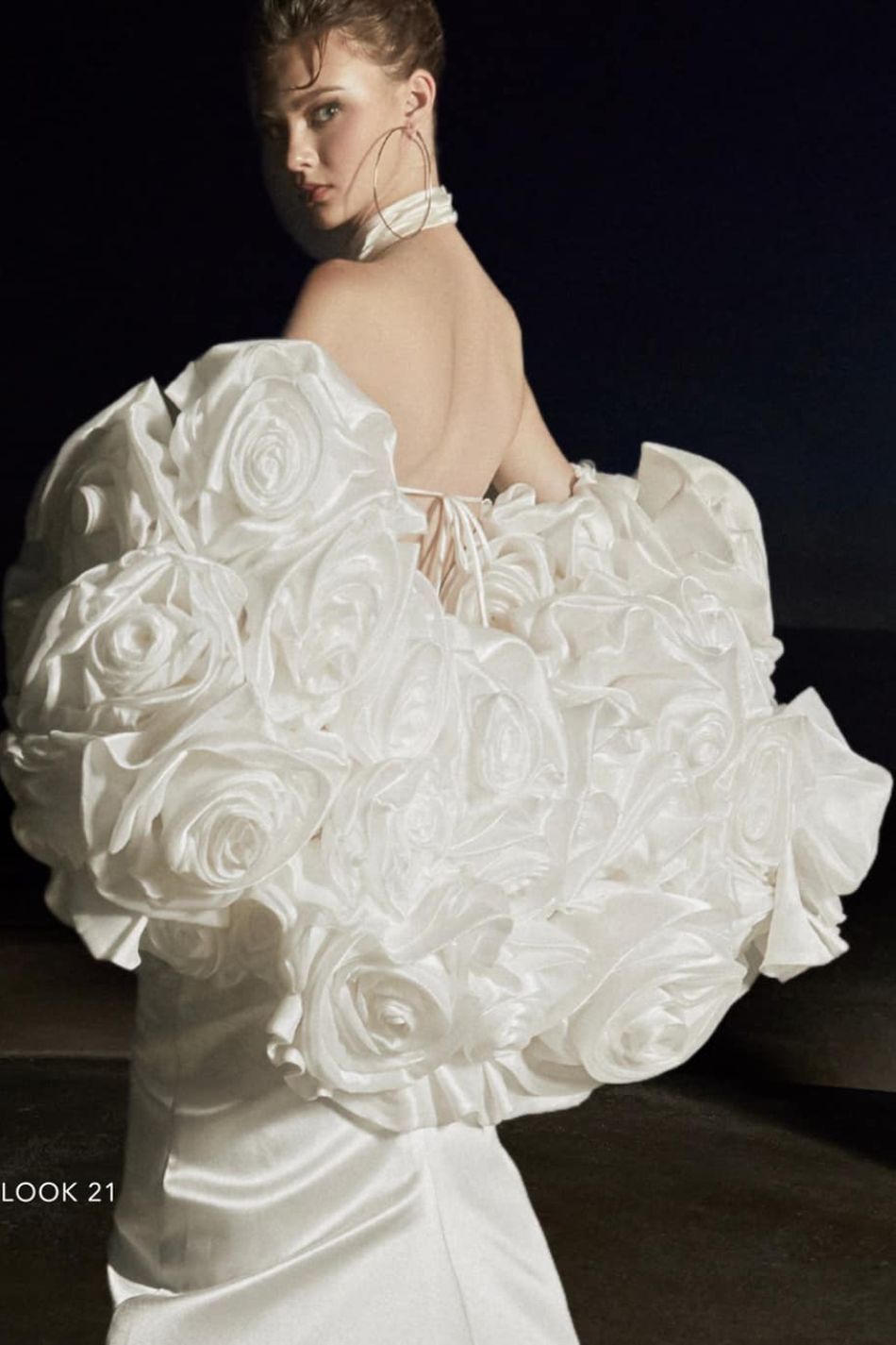 Váy trắng dài cổ yếm khoét eo kèm choàng bông hồng bự MAEL FEMME